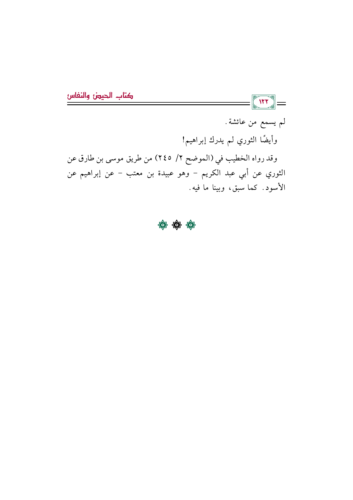 وقد رواه الخطيب في (الموضح ٢/ ٢٤٥) من طريق موسى بن طارق عن الثوري عن أبي عبد الكريم - وهو عبيدة بن معتب - عن إبراهيم عن الأسود. كما سبق، وبينا ما فيه.