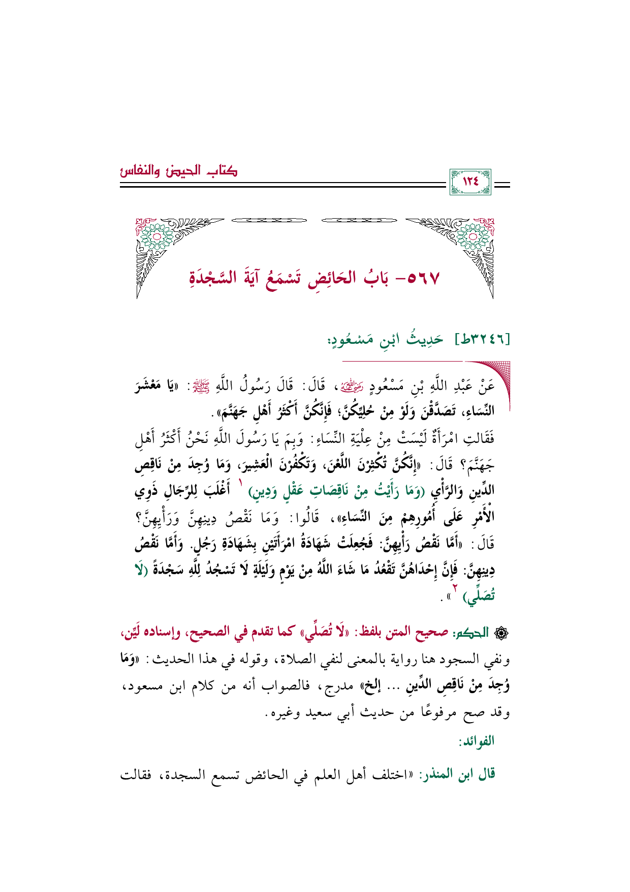 [الحكم]: صحيح المتن بلفظ: ((لَا تُصَلِّي)) كما تقدم في الصحيح، وإسناده لَيِّن، ونفي السجود هنا رواية بالمعنى لنفي الصلاة، وقوله في هذا الحديث: ((وَمَا وُجِدَ مِنْ نَاقِصِ الدِّينِ ... إلخ)) مدرج، فالصواب أنه من كلام ابن مسعود، وقد صح مرفوعًا من حديث أبي سعيد وغيره.