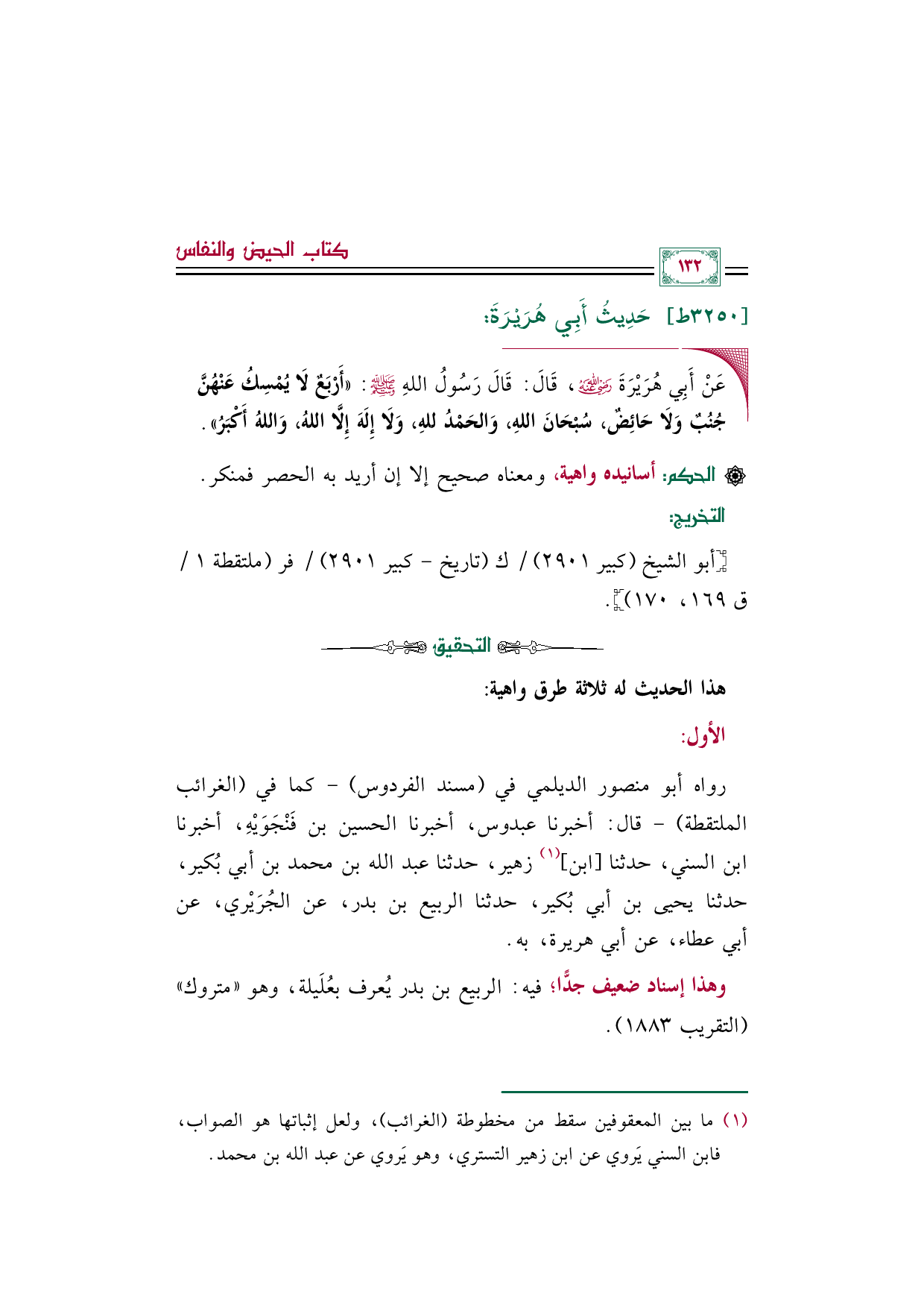 رواه أبو منصور الديلمي في (مسند الفردوس) - كما في (الغرائب الملتقطة) - قال: أخبرنا عبدوس، أخبرنا الحسين بن فَنْجَوَيْهِ، أخبرنا ابن السني، حدثنا [ابن] (¬١) زهير، حدثنا عبد الله بن محمد بن أبي بُكير، حدثنا يحيى بن أبي بُكير، حدثنا الربيع بن بدر، عن الجُرَيْري، عن أبي عطاء، عن أبي هريرة، به.