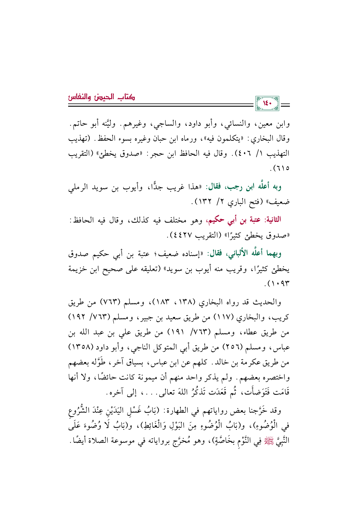 الثانية: عتبة بن أبي حكيم، وهو مختلف فيه كذلك، وقال فيه الحافظ: ((صدوق يخطئ كثيرًا)) (التقريب ٤٤٢٧).