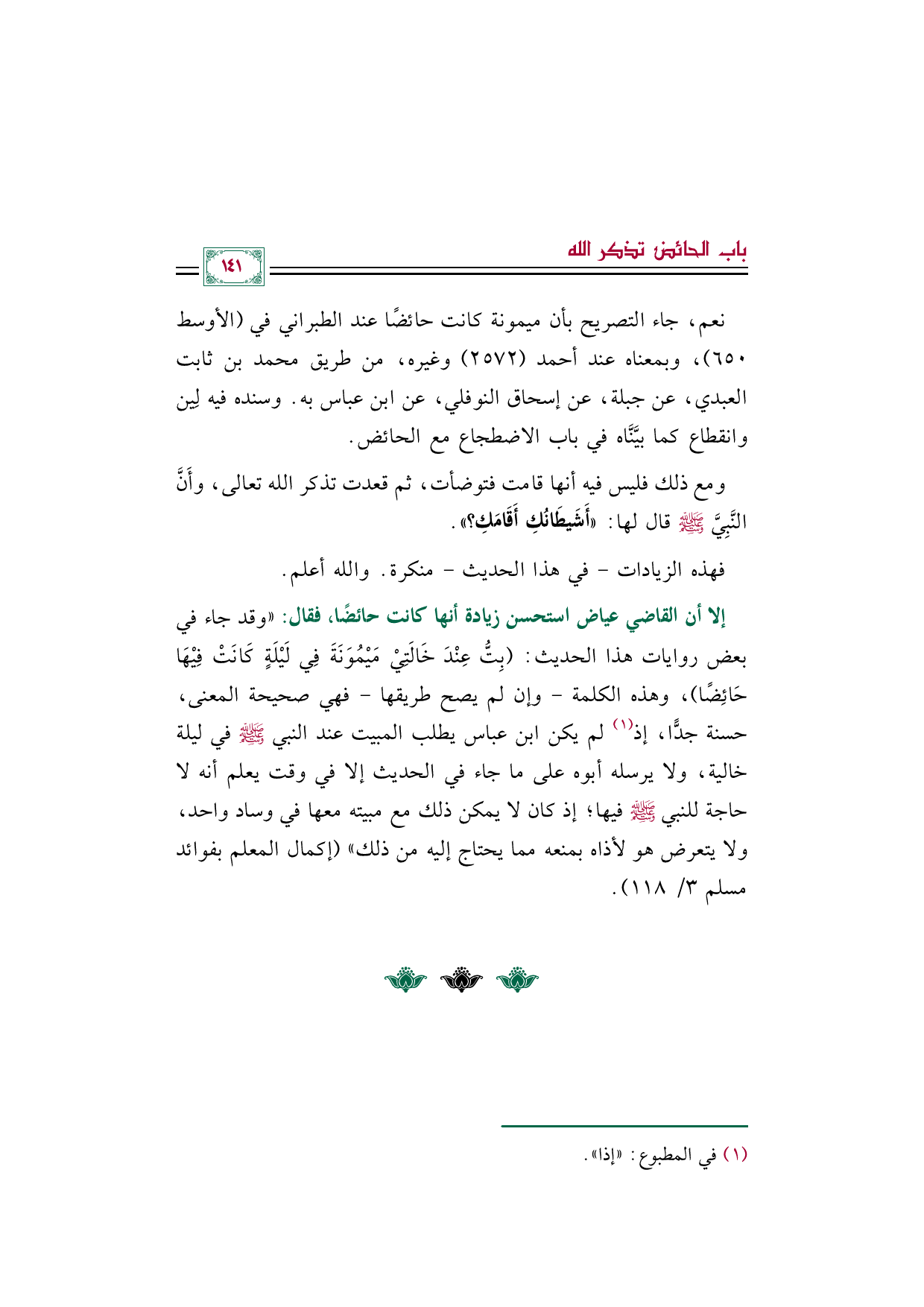 إلا أن القاضي عياض استحسن زيادة أنها كانت حائضًا، فقال: ((وقد جاء في بعض روايات هذا الحديث: (بِتُّ عِنْدَ خَالَتِيْ مَيْمُوَنَةَ فِي لَيْلَةٍ كَانَتْ فِيْهَا حَائِضًا)، وهذه الكلمة -وإن لم يصح طريقها - فهي صحيحة المعنى، حسنة جدًّا، إذ (¬١) لم يكن ابن عباس يطلب المبيت عند النبي صلى الله عليه وسلم في ليلة خالية، ولا يرسله أبوه على ما جاء في الحديث إلا في وقت يعلم أنه لا حاجة للنبي صلى الله عليه وسلم فيها؛ إذ كان لا يمكن ذلك مع مبيته معها في وساد واحد، ولا يتعرض هو لأذاه بمنعه مما يحتاج إليه من ذلك)) (إكمال المعلم بفوائد مسلم ٣/ ١١٨).