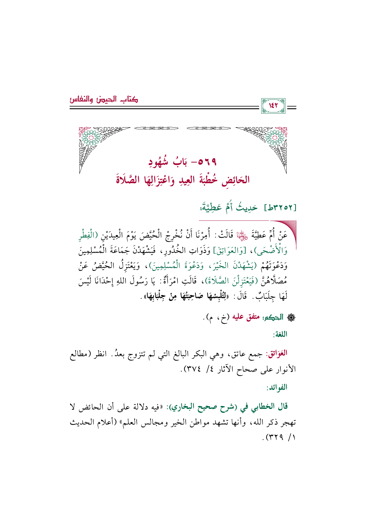 ٥٦٩ - بَابُ شُهُودِ الحَائِضِ خُطْبَةَ العِيدِ وَاعْتِزَالِهَا الصَّلَاةَ