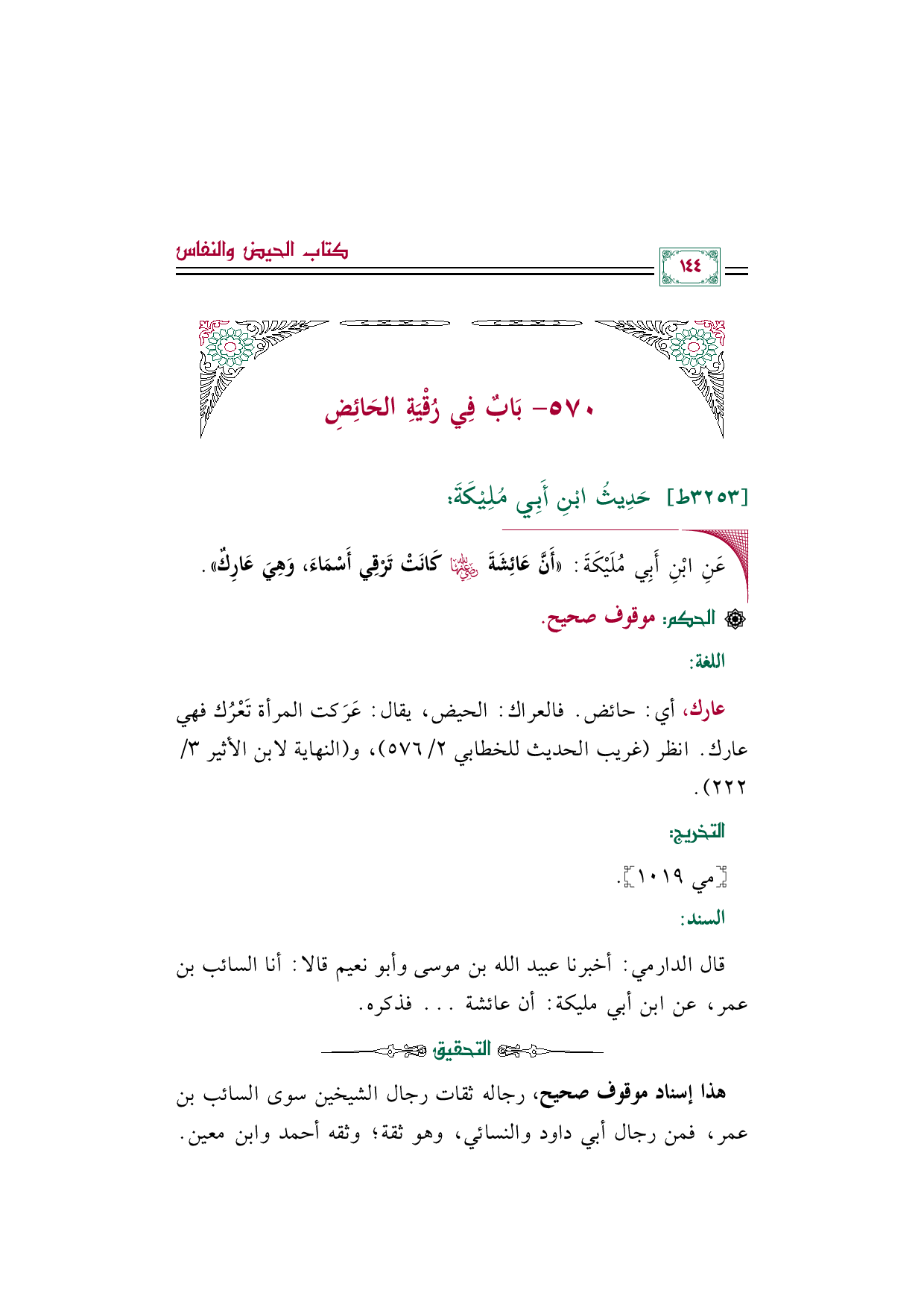 ◼ عَنِ ابْنِ أَبِي مُلَيْكَةَ: ((أَنَّ عَائِشَةَ رَضِيَ اللهُ عَنْهَا كَانَتْ تَرْقِي أَسْمَاءَ، وَهِيَ عَارِكٌ)).