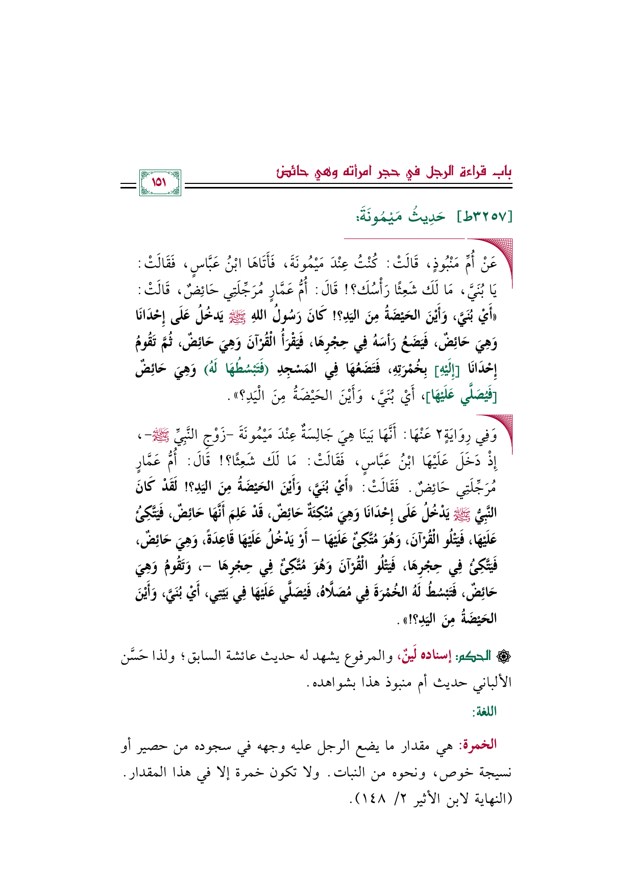 ◼ عَنْ أُمِّ مَنْبُوذٍ، قَالَتْ: كُنْتُ عِنْدَ مَيْمُونَةَ، فَأَتَاهَا ابْنُ عَبَّاسٍ، فَقَالَتْ: يَا بُنَيَّ، مَا لَكَ شَعِثًا رَأْسُكَ؟ ! قَالَ: أُمُّ عَمَّارٍ مُرَجِّلَتِي حَائِضٌ، قَالَتْ: ((أَيْ بُنَيَّ، وَأَيْنَ الحَيْضَةُ مِنَ اليَدِ؟ ! كَانَ رَسُولُ اللهِ صَلَّى اللهُ عَلَيْهِ وَسَلَّمَ يَدخُلُ عَلَى إِحْدَانَا وَهِيَ حَائِضٌ، فَيَضَعُ رَأسَهُ فِي حِجْرِهَا، فَيَقْرَأُ الْقُرْآنَ وَهِيَ حَائِضٌ، ثُمَّ تَقُومُ إِحْدَانَا [إِلَيْهِ] بِخُمْرَتِهِ، فَتَضَعُهَا فِي المَسْجِدِ (فَتَبْسُطُهَا لَهُ) وَهِيَ حَائِضٌ [فَيُصَلَّي عَلَيْهَا]، أَيْ بُنَيَّ، وَأَيْنَ الحَيْضَةُ مِنَ الْيَدِ؟ )).