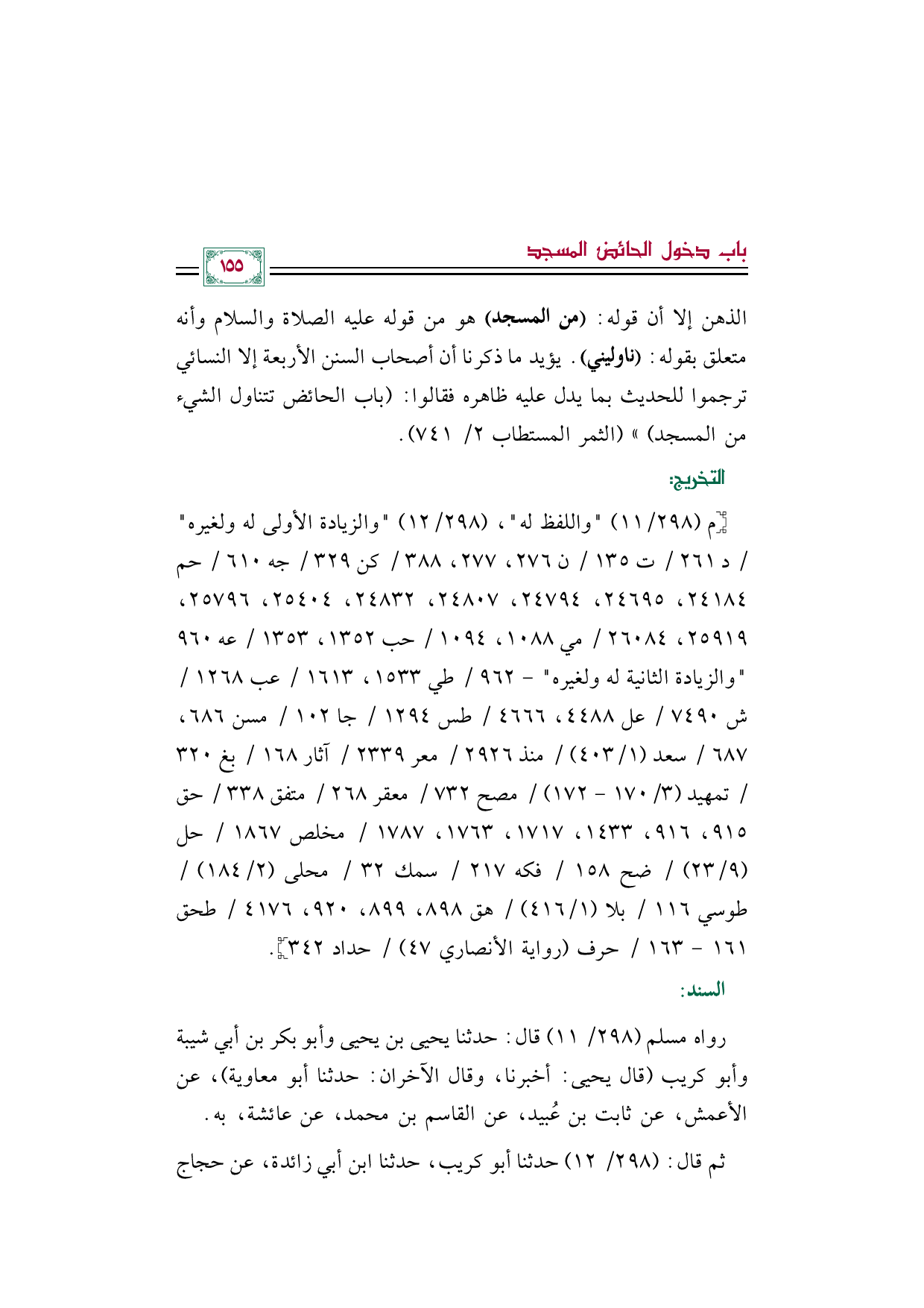 الذهن إلا أن قوله: (من المسجد) هو من قوله عليه الصلاة والسلام وأنه متعلق بقوله: (ناوليني). يؤيد ما ذكرنا أن أصحاب السنن الأربعة إلا النسائي ترجموا للحديث بما يدل عليه ظاهره فقالوا: (باب الحائض تتناول الشيء من المسجد))) (الثمر المستطاب ٢/ ٧٤١).