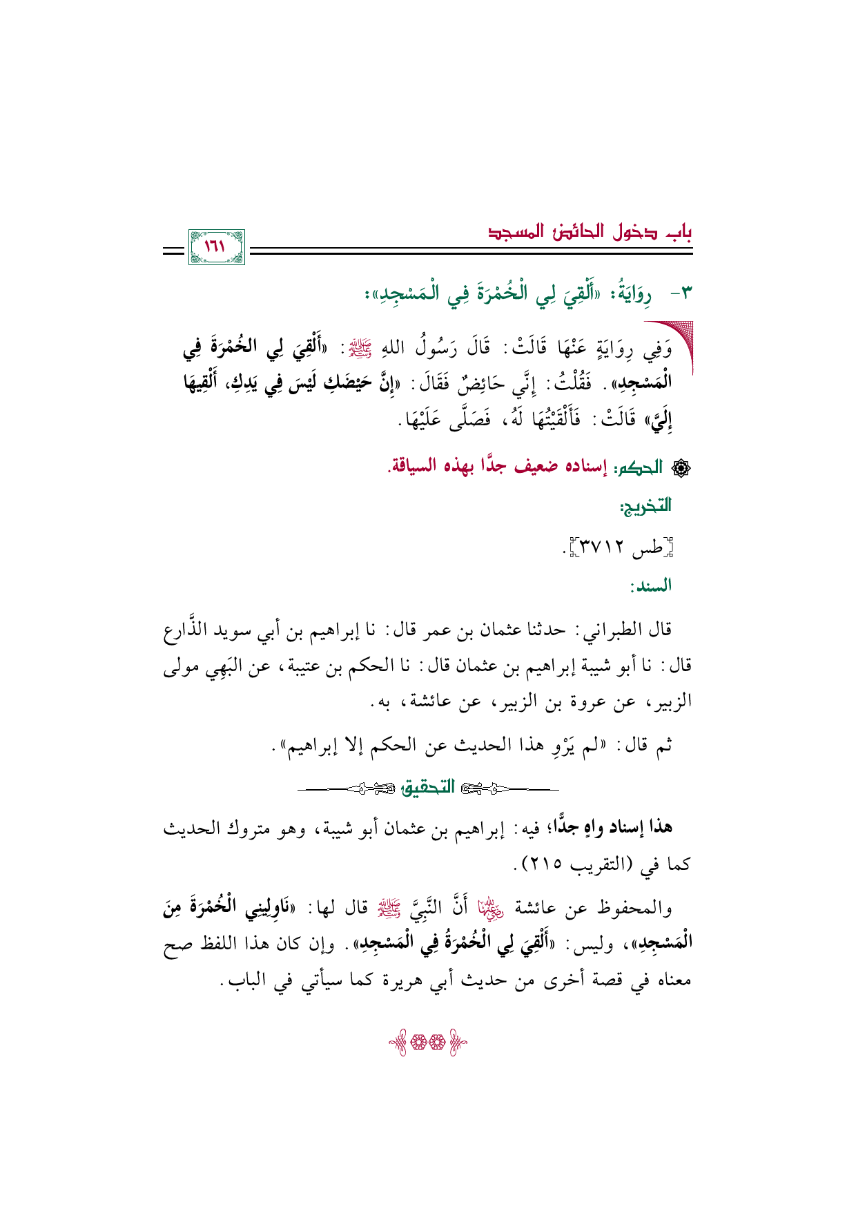 والمحفوظ عن عائشة رضي الله عنها أَنَّ النَّبِيَّ صلى الله عليه وسلم قال لها: ((نَاوِلِينِي الْخُمْرَةَ مِنَ الْمَسْجِدِ))، وليس: ((أَلْقِيَ لِي الْخُمْرَةُ فِي الْمَسْجِدِ)). وإن كان هذا اللفظ صح معناه في قصة أخرى من حديث أبي هريرة كما سيأتي في الباب.