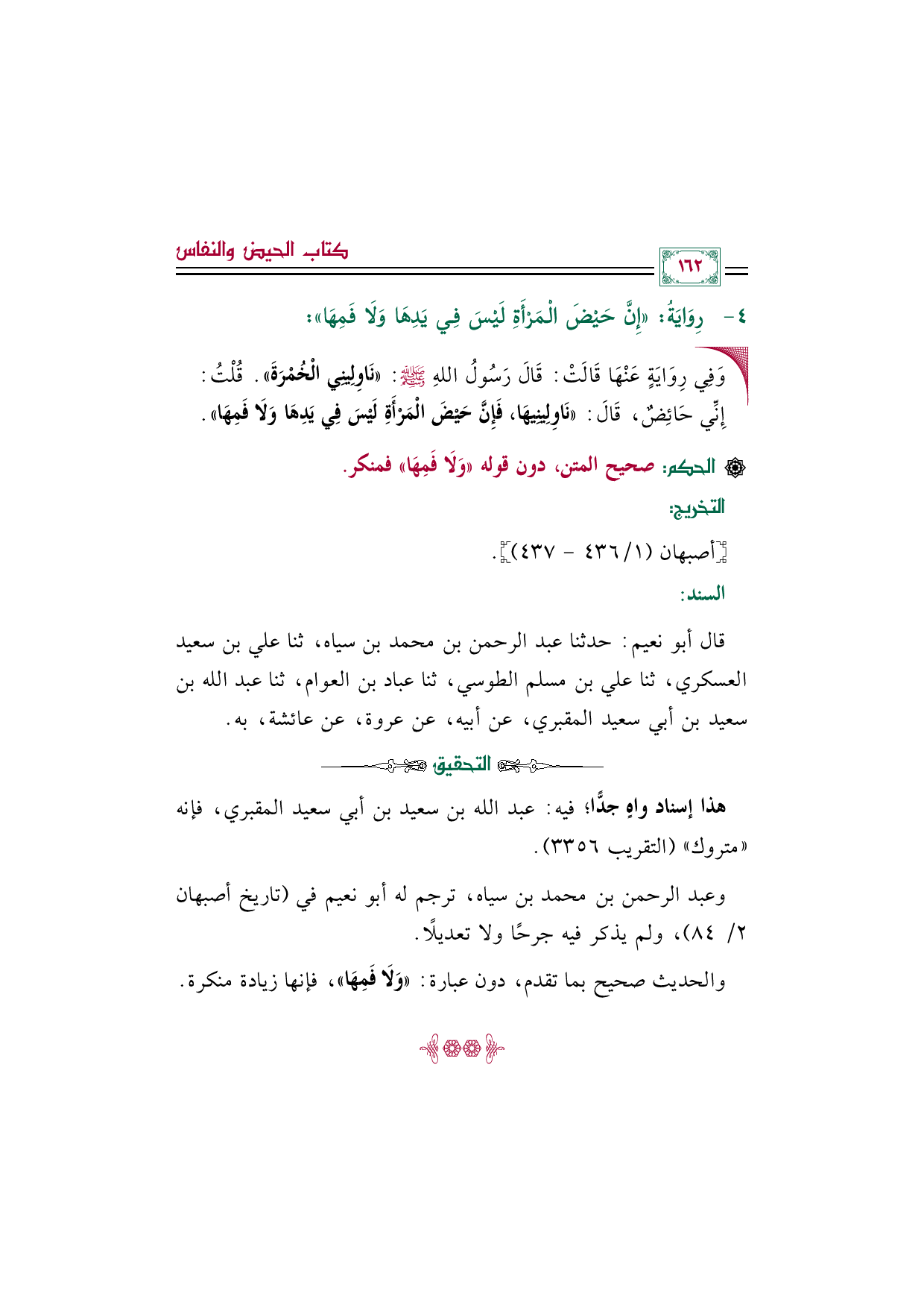 والحديث صحيح بما تقدم، دون عبارة: ((وَلَا فَمِهَا))، فإنها زيادة منكرة.