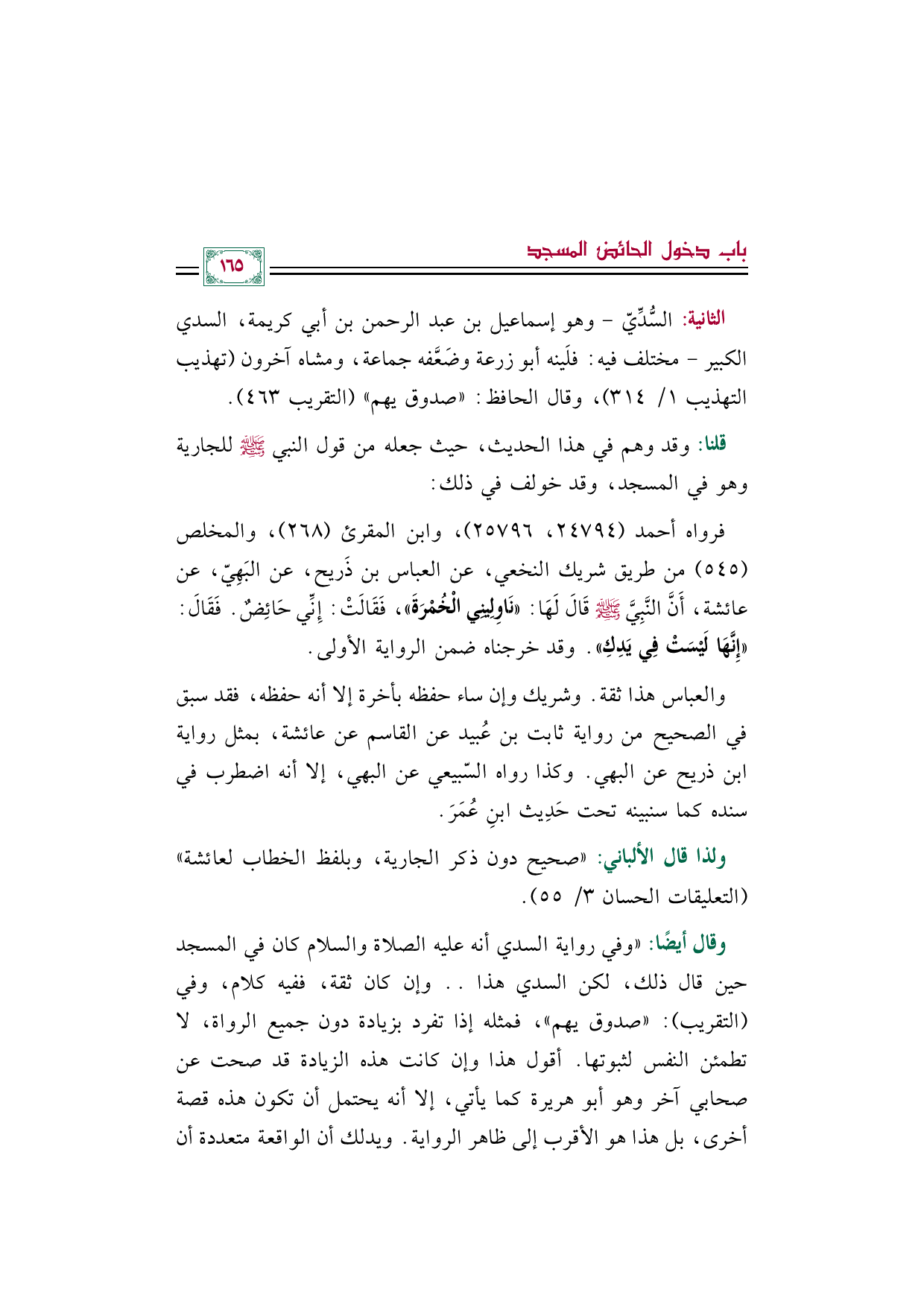 وقال أيضًا: ((وفي رواية السدي أنه عليه الصلاة والسلام كان في المسجد حين قال ذلك، لكن السدي هذا .. وإن كان ثقة، ففيه كلام، وفي (التقريب): ((صدوق يهم))، فمثله إذا تفرد بزيادة دون جميع الرواة، لا تطمئن النفس لثبوتها. أقول هذا وإن كانت هذه الزيادة قد صحت عن صحابي آخر وهو أبو هريرة كما يأتي، إلا أنه يحتمل أن تكون هذه قصة أخرى، بل هذا هو الأقرب إلى ظاهر الرواية. ويدلك أن الواقعة متعددة أن