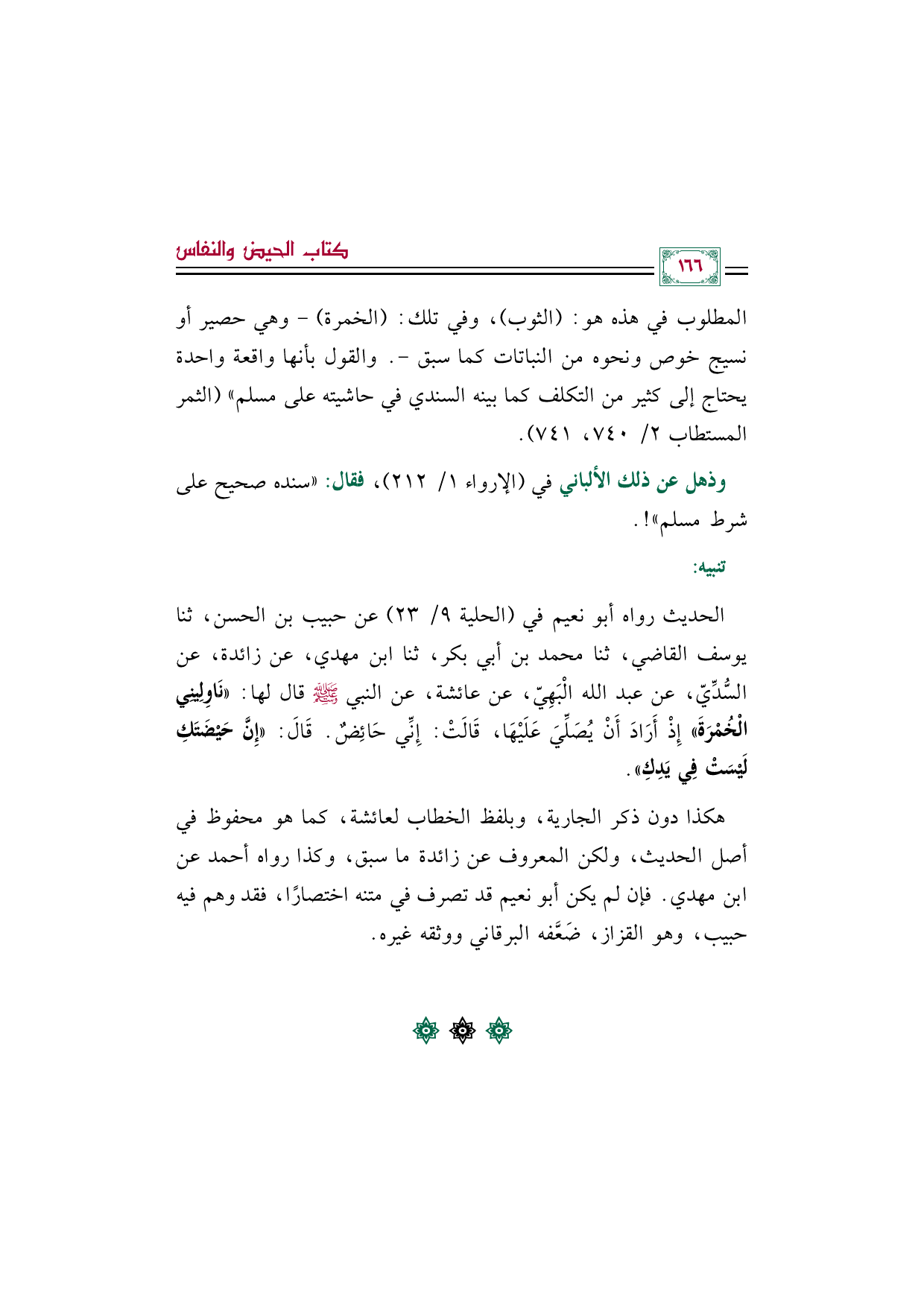 الحديث رواه أبو نعيم في (الحلية ٩/ ٢٣) عن حبيب بن الحسن، ثنا يوسف القاضي، ثنا محمد بن أبي بكر، ثنا ابن مهدي، عن زائدة، عن السُّدِّيّ، عن عبد الله الْبَهِيّ، عن عائشة، عن النبي صلى الله عليه وسلم قال لها: ((نَاوِلِينِي الْخُمْرَةَ)) إِذْ أَرَادَ أَنْ يُصَلِّيَ عَلَيْهَا، قَالَتْ: إِنِّي حَائِضٌ. قَالَ: ((إِنَّ حَيْضَتَكِ لَيْسَتْ فِي يَدِكِ)).