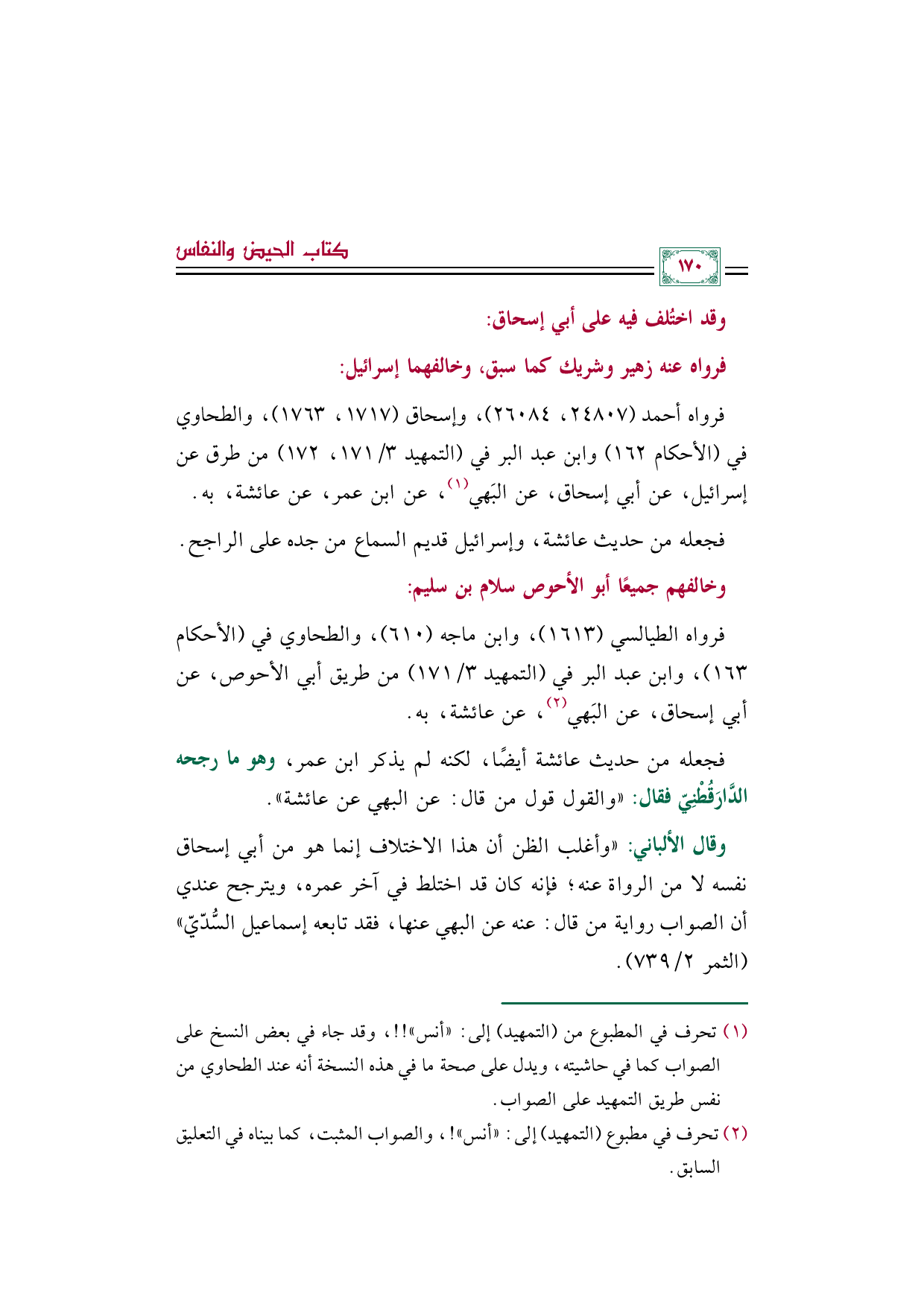 وقال الألباني: ((وأغلب الظن أن هذا الاختلاف إنما هو من أبي إسحاق نفسه لا من الرواة عنه؛ فإنه كان قد اختلط في آخر عمره، ويترجح عندي أن الصواب رواية من قال: عنه عن البهي عنها، فقد تابعه إسماعيل السُّدّيّ)) (الثمر ٢/ ٧٣٩).