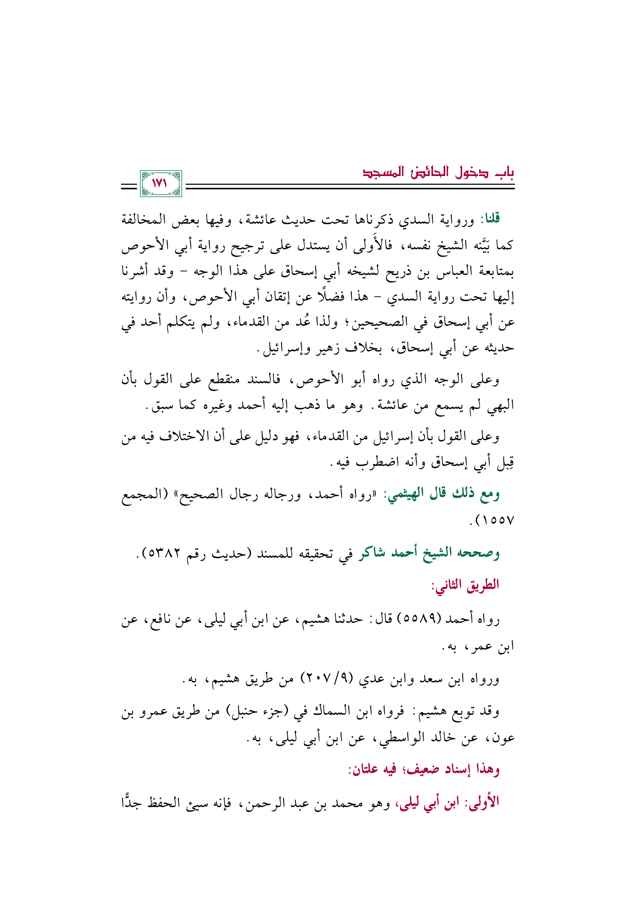 قلنا: ورواية السدي ذكرناها تحت حديث عائشة، وفيها بعض المخالفة كما بَيَّنه الشيخ نفسه، فالأَولى أن يستدل على ترجيح رواية أبي الأحوص بمتابعة العباس بن ذريح لشيخه أبي إسحاق على هذا الوجه - وقد أشرنا إليها تحت رواية السدي - هذا فضلًا عن إتقان أبي الأحوص، وأن روايته عن أبي إسحاق في الصحيحين؛ ولذا عُد من القدماء، ولم يتكلم أحد في حديثه عن أبي إسحاق، بخلاف زهير وإسرائيل.