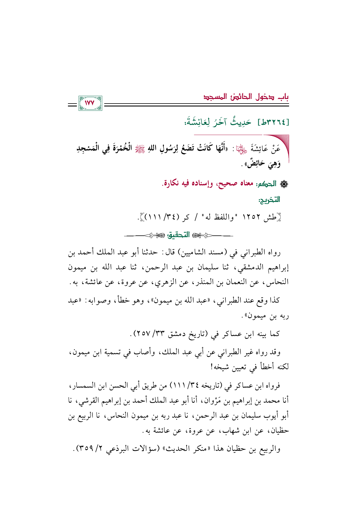 رواه الطبراني في (مسند الشاميين) قال: حدثنا أبو عبد الملك أحمد بن إبراهيم الدمشقي، ثنا سليمان بن عبد الرحمن، ثنا عبد الله بن ميمون النحاس، عن النعمان بن المنذر، عن الزهري، عن عروة، عن عائشة، به.