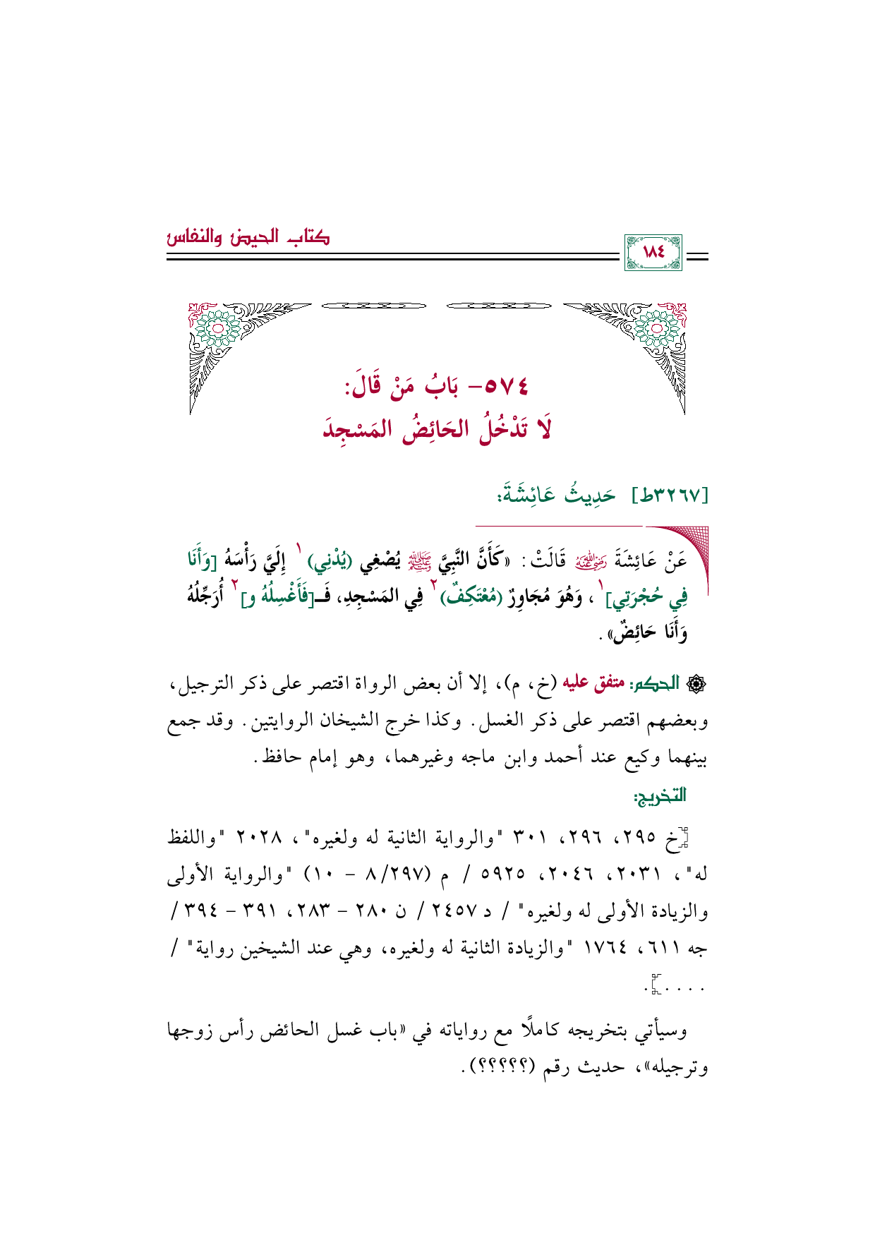 وسيأتي بتخريجه كاملًا مع رواياته في "باب غسل الحائض رأس زوجها وترجيله"، حديث رقم (؟ ؟ ؟ ؟ ؟ ).