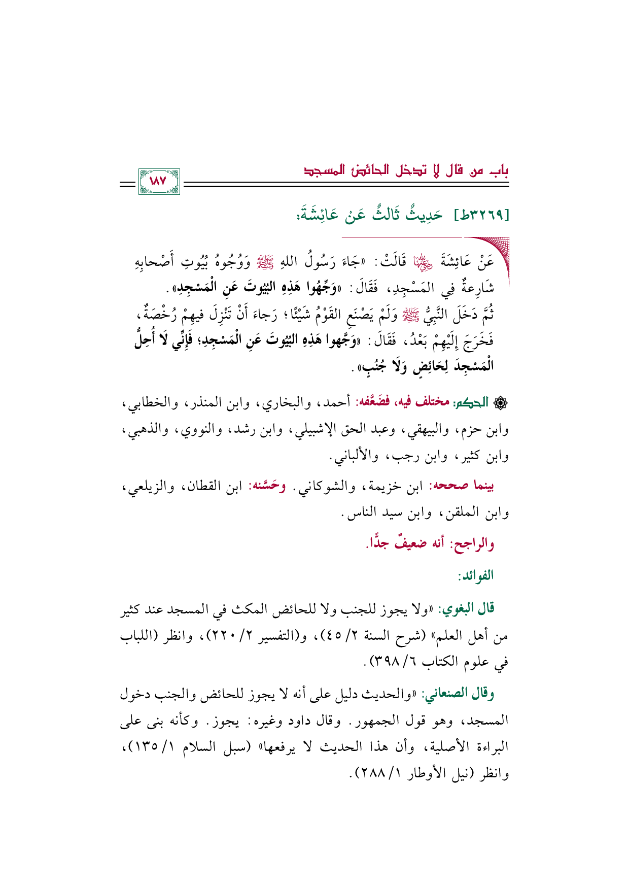 وقال الصنعاني: ((والحديث دليل على أنه لا يجوز للحائض والجنب دخول المسجد، وهو قول الجمهور. وقال داود وغيره: يجوز. وكأنه بنى على البراءة الأصلية، وأن هذا الحديث لا يرفعها)) (سبل السلام ١/ ١٣٥)، وانظر (نيل الأوطار ١/ ٢٨٨).