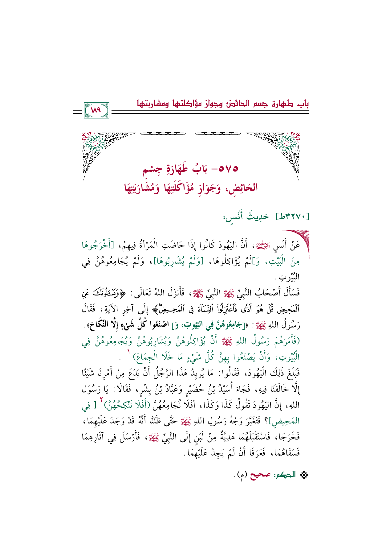 ◼ عَنْ أَنَسٍ رضي الله عنه، أَنَّ اليَهُودَ كَانُوا إِذَا حَاضَتِ الْمَرْأةُ فِيهِمْ، [أَخْرَجُوهَا مِنَ الْبَيْتِ، وَ] لَمْ يُؤَاكِلُوهَا، [وَلَمْ يُشَارِبُوهَا]، وَلَمْ يُجَامِعُوهُنَّ فِي البُيُوتِ.