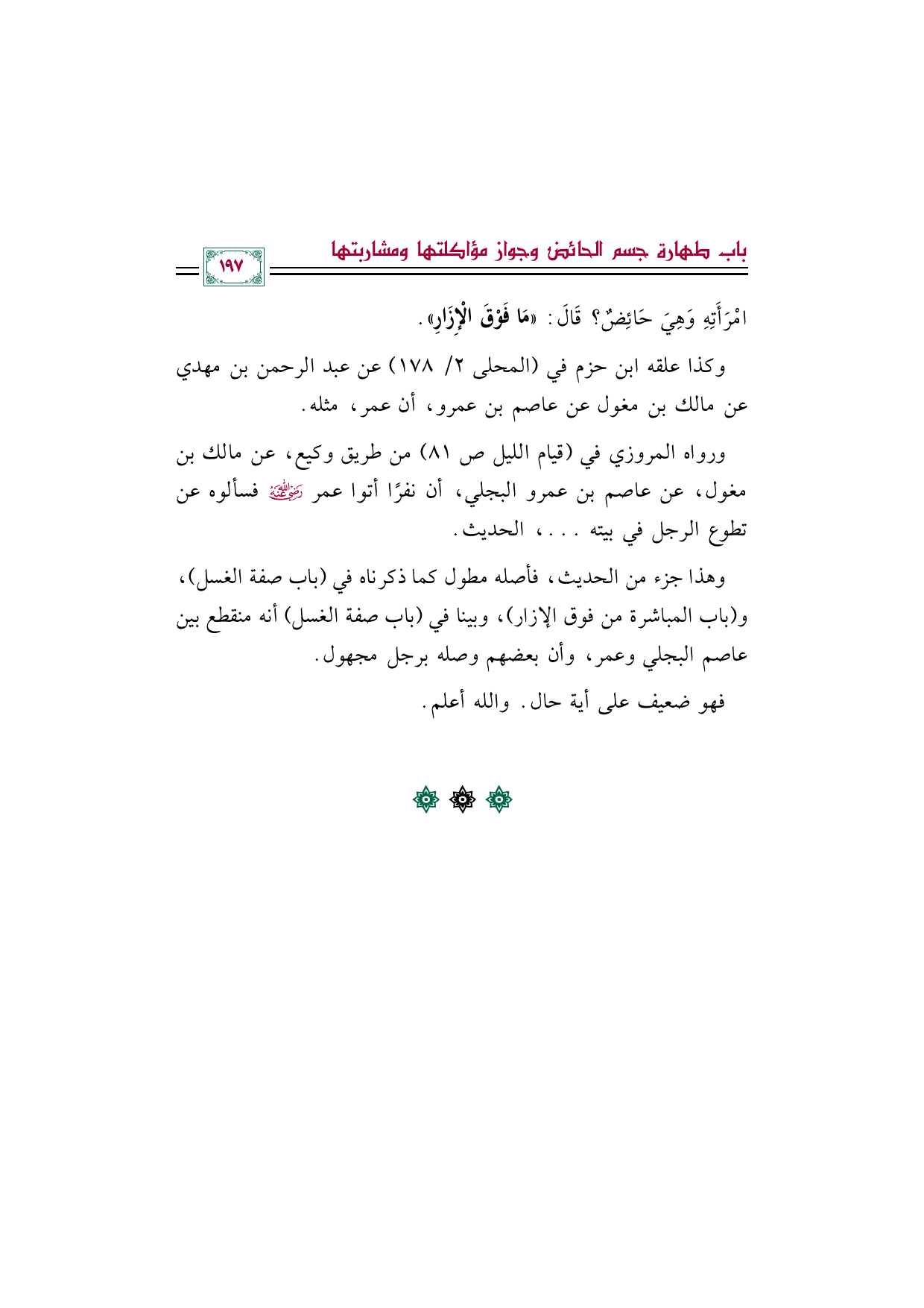 امْرَأَتِهِ وَهِيَ حَائِضٌ؟ قَالَ: ((مَا فَوْقَ الْإِزَارِ)).