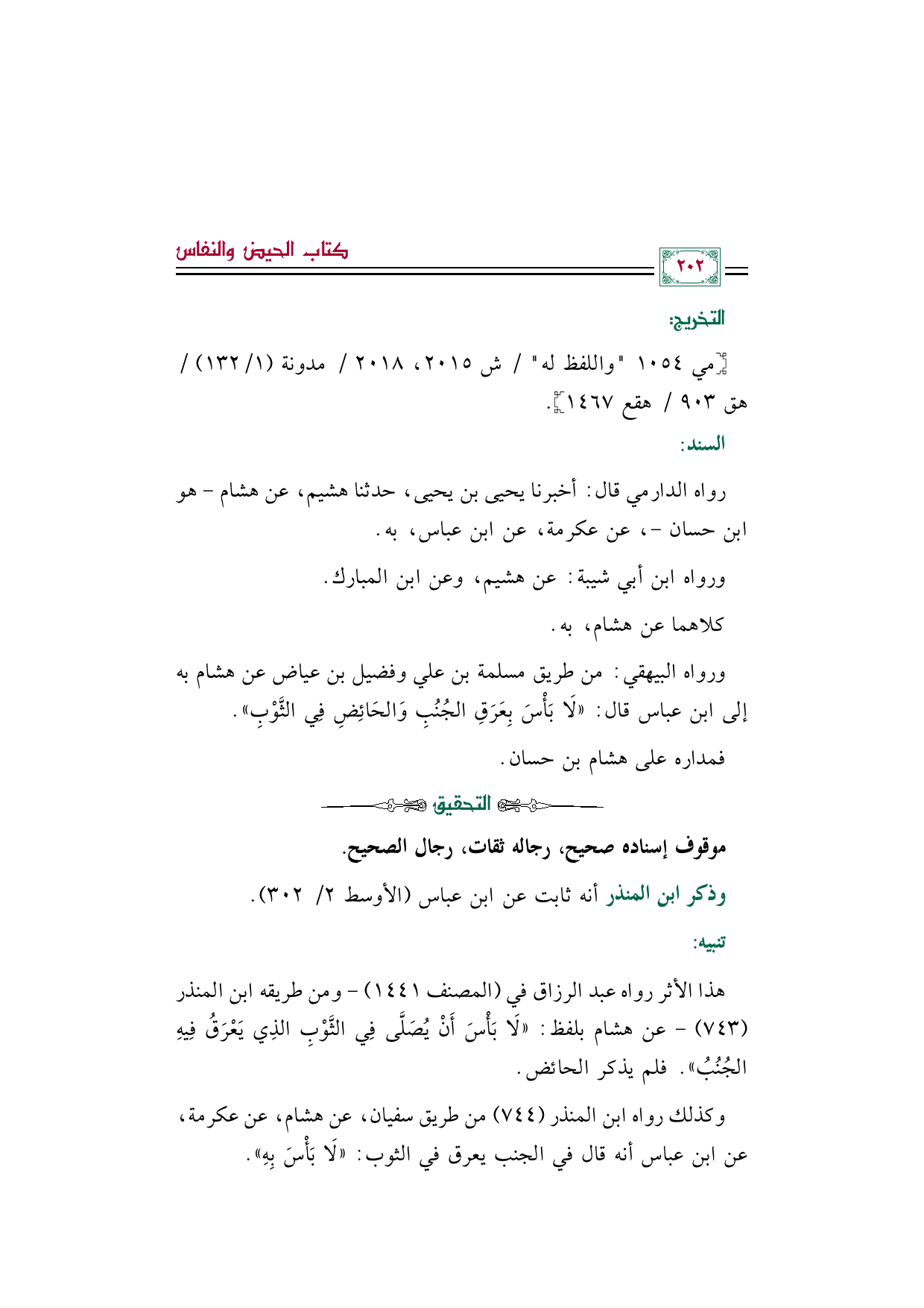 ورواه البيهقي: من طريق مسلمة بن علي وفضيل بن عياض عن هشام به إلى ابن عباس قال: ((لَا بَأْسَ بِعَرَقِ الجُنُبِ وَالحَائِضِ فِي الثَّوْبِ)).