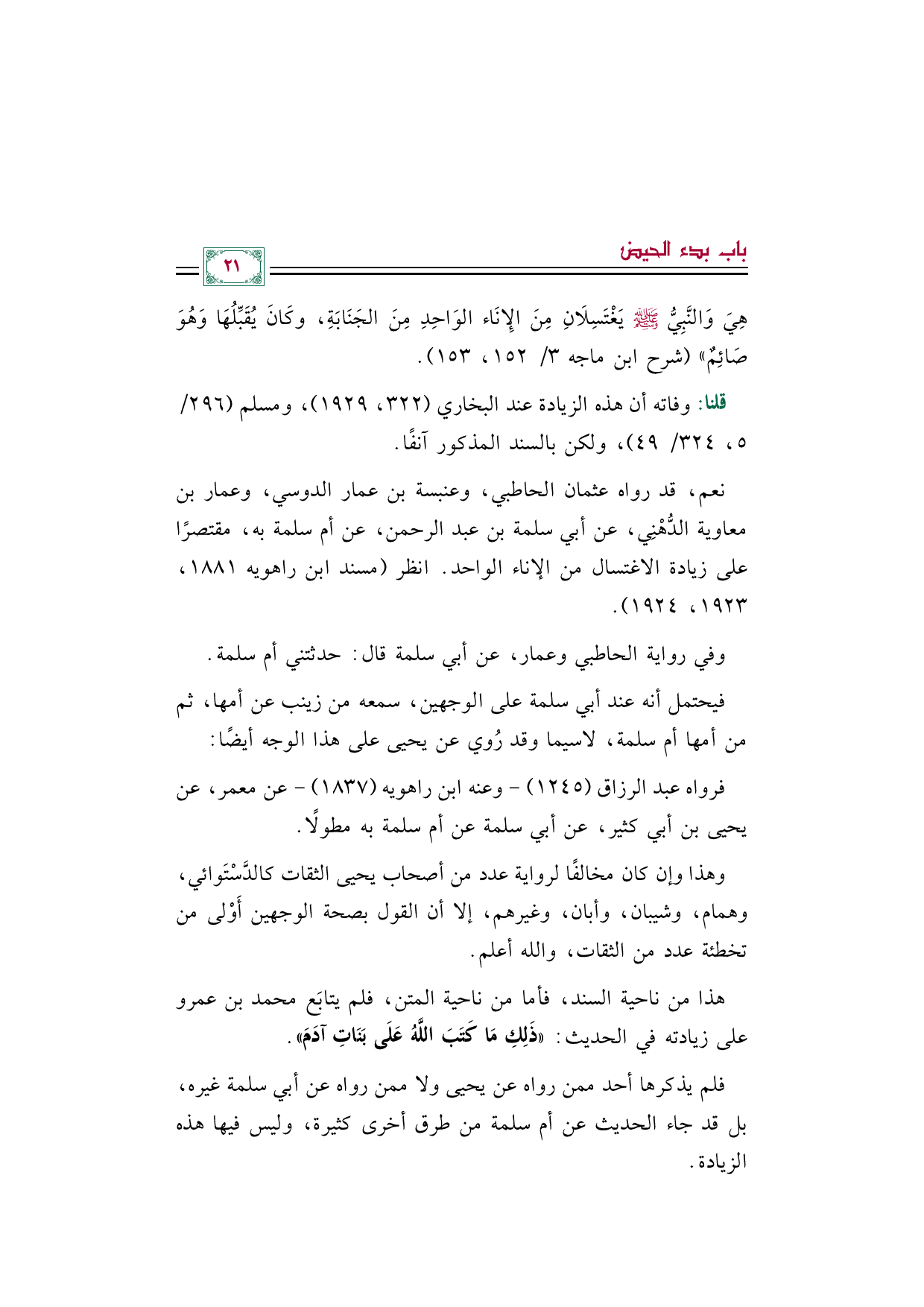 هذا من ناحية السند، فأما من ناحية المتن، فلم يتابَع محمد بن عمرو على زيادته في الحديث: ((ذَلِكِ مَا كَتَبَ اللَّهُ عَلَى بَنَاتِ آدَمَ)).