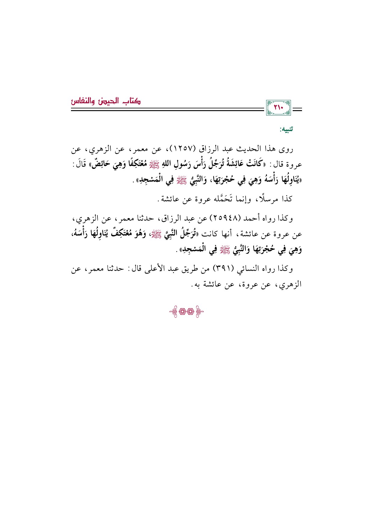 روى هذا الحديث عبد الرزاق (١٢٥٧)، عن معمر، عن الزهري، عن عروة قال: ((كَانَتْ عَائِشَةُ تُرَجِّلُ رَأْسَ رَسُولِ اللهِ صَلَّى اللهُ عَلَيْهِ وَسَلَّمَ مُعْتَكِفًا وَهِيَ حَائِضٌ)) قَالَ: ((يُنَاوِلُهَا رَأْسَهُ وَهِيَ فِي حُجْرَتِهَا، وَالنَّبِيُّ صَلَّى اللهُ عَلَيْهِ وَسَلَّمَ فِي الْمَسْجِدِ)).