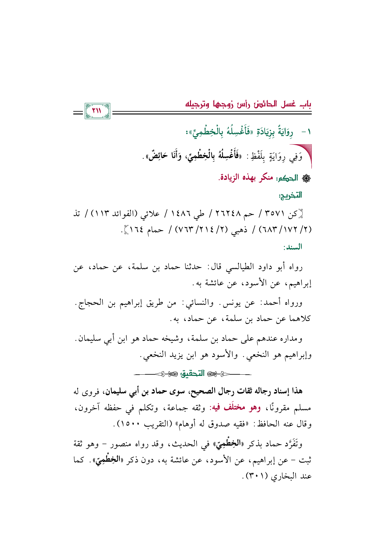 وتَفَرَّد حماد بذكر ((الخِطْمِيّ)) في الحديث، وقد رواه منصور -وهو ثقة ثبت- عن إبراهيم، عن الأسود، عن عائشة به، دون ذكر ((الخِطْمِيّ)). كما عند البخاري (٣٠١).
