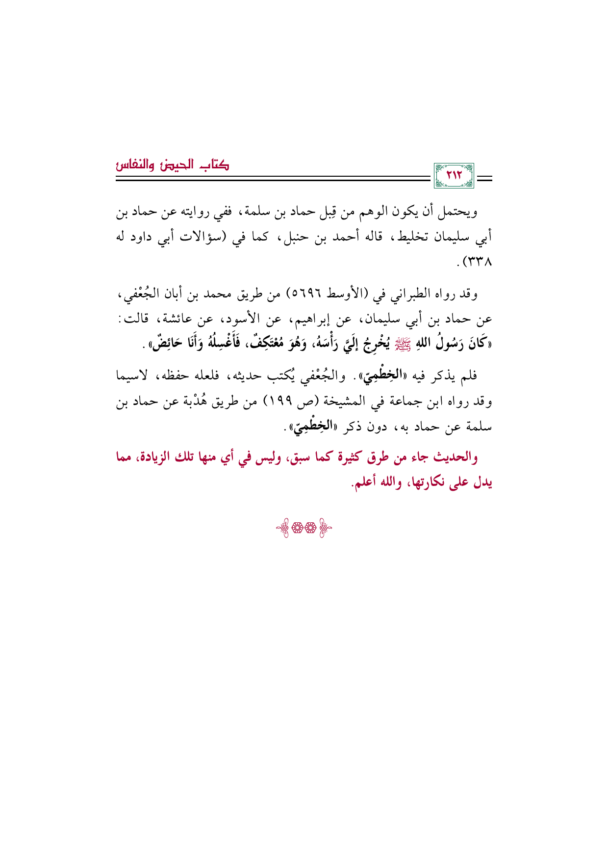 وقد رواه الطبراني في (الأوسط ٥٦٩٦) من طريق محمد بن أبان الجُعْفي، عن حماد بن أبي سليمان، عن إبراهيم، عن الأسود، عن عائشة، قالت: ((كَانَ رَسُولُ اللهِ صَلَّى اللهُ عَلَيْهِ وَسَلَّمَ يُخْرِجُ إلَيَّ رَأْسَهُ، وَهُوَ مُعْتَكِفٌ، فَأَغْسِلُهُ وَأَنَا حَائِضٌ)).