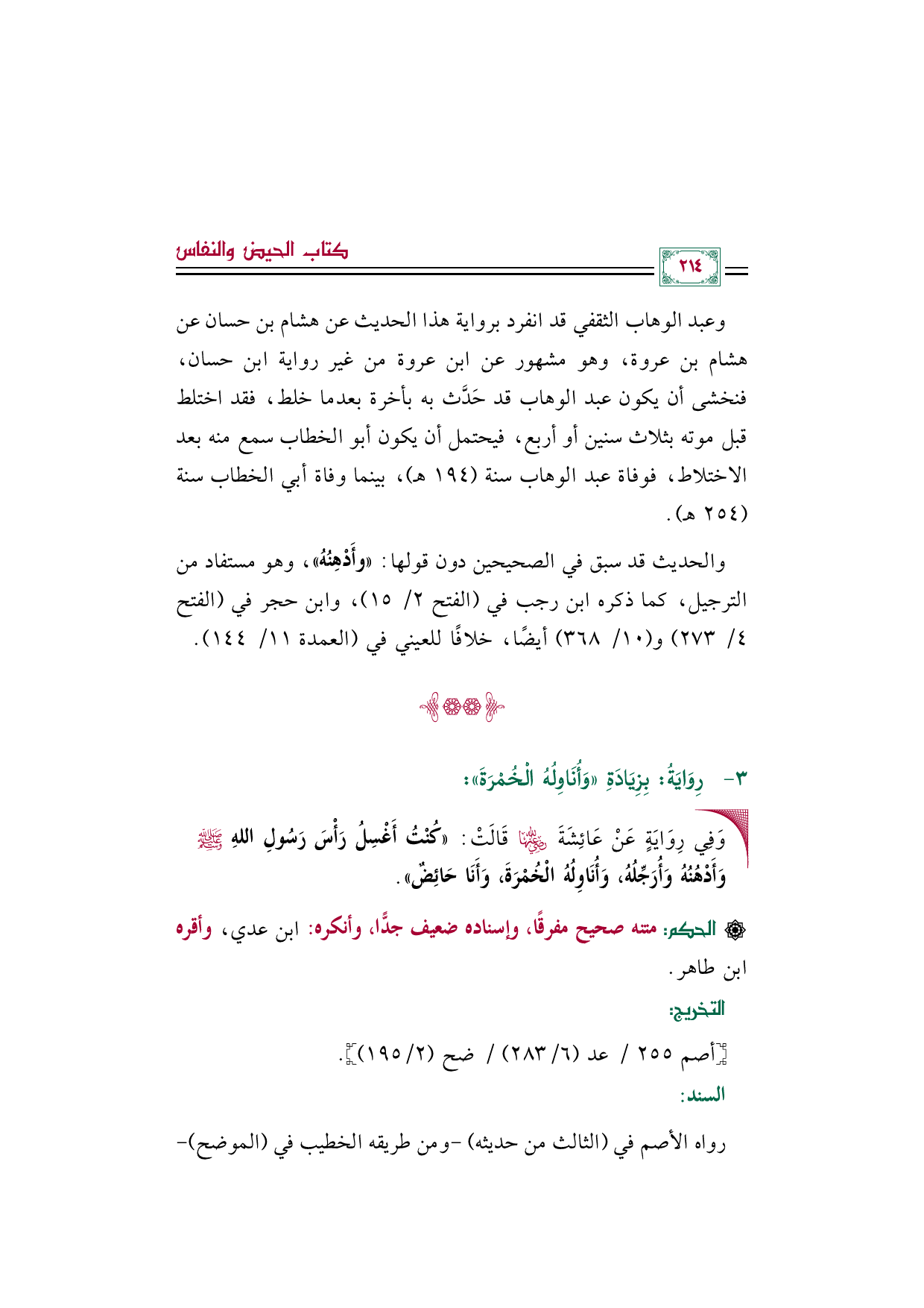 والحديث قد سبق في الصحيحين دون قولها: ((وأَدْهِنُهُ))، وهو مستفاد من الترجيل، كما ذكره ابن رجب في (الفتح ٢/ ١٥)، وابن حجر في (الفتح ٤/ ٢٧٣) و (١٠/ ٣٦٨) أيضًا، خلافًا للعيني في (العمدة ١١/ ١٤٤).