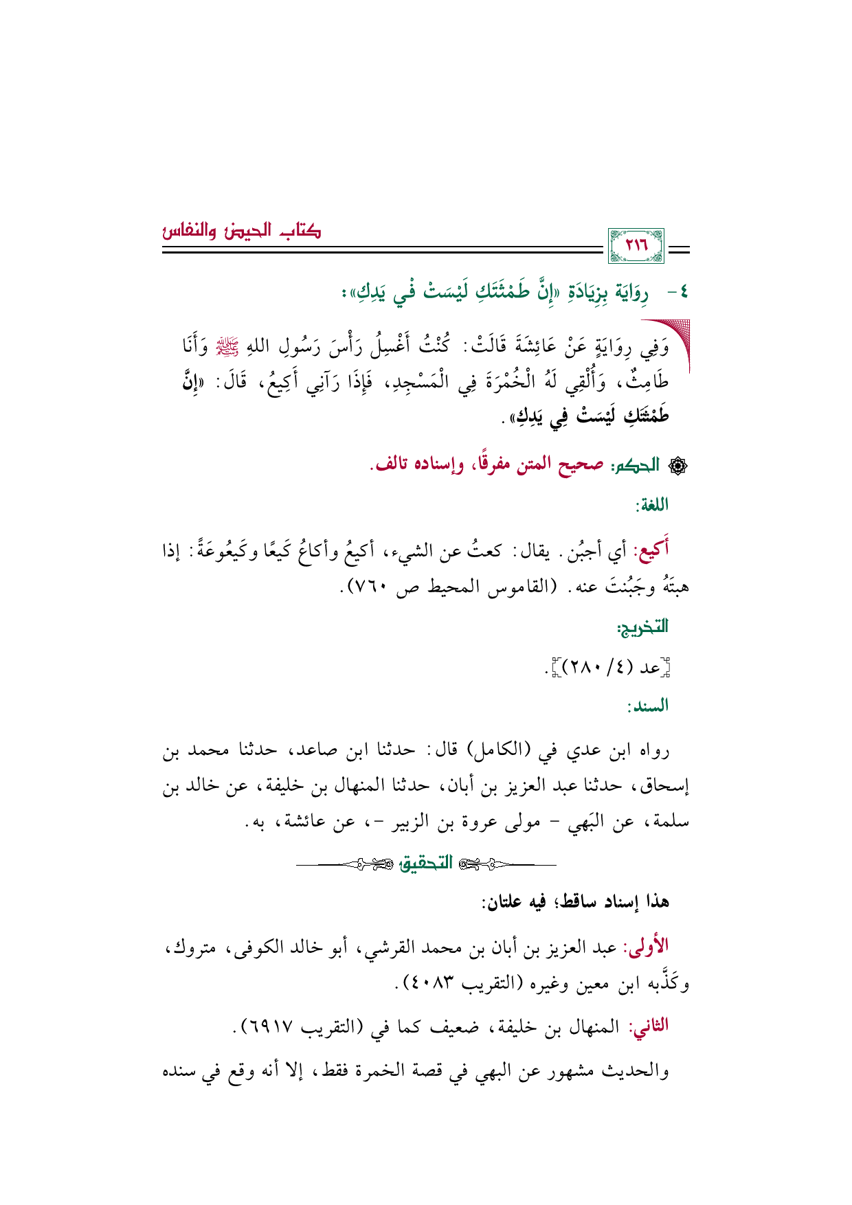 رواه ابن عدي في (الكامل) قال: حدثنا ابن صاعد، حدثنا محمد بن إسحاق، حدثنا عبد العزيز بن أبان، حدثنا المنهال بن خليفة، عن خالد بن سلمة، عن البَهي - مولى عروة بن الزبير -، عن عائشة، به.