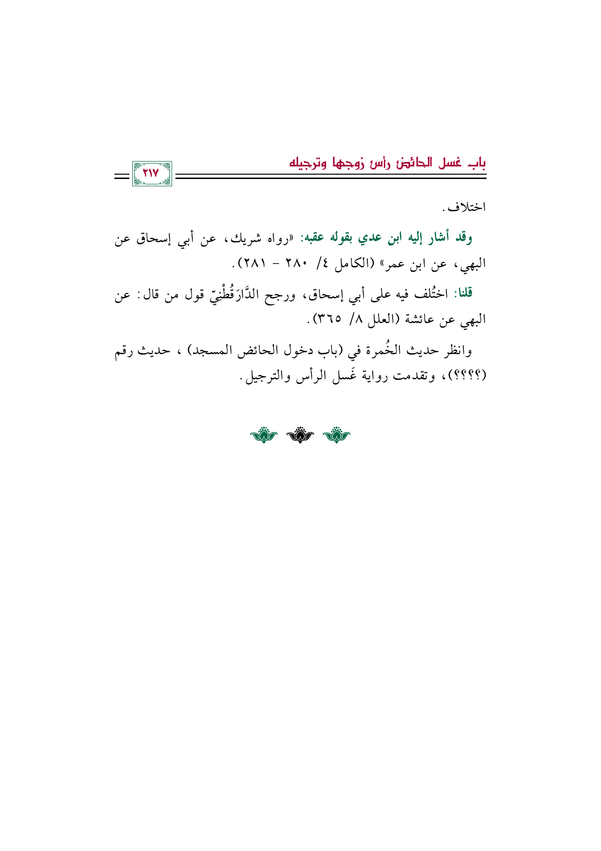 وانظر حديث الخُمرة في (باب دخول الحائض المسجد)، حديث رقم (؟ ؟ ؟ ؟ )، وتقدمت رواية غَسل الرأس والترجيل.