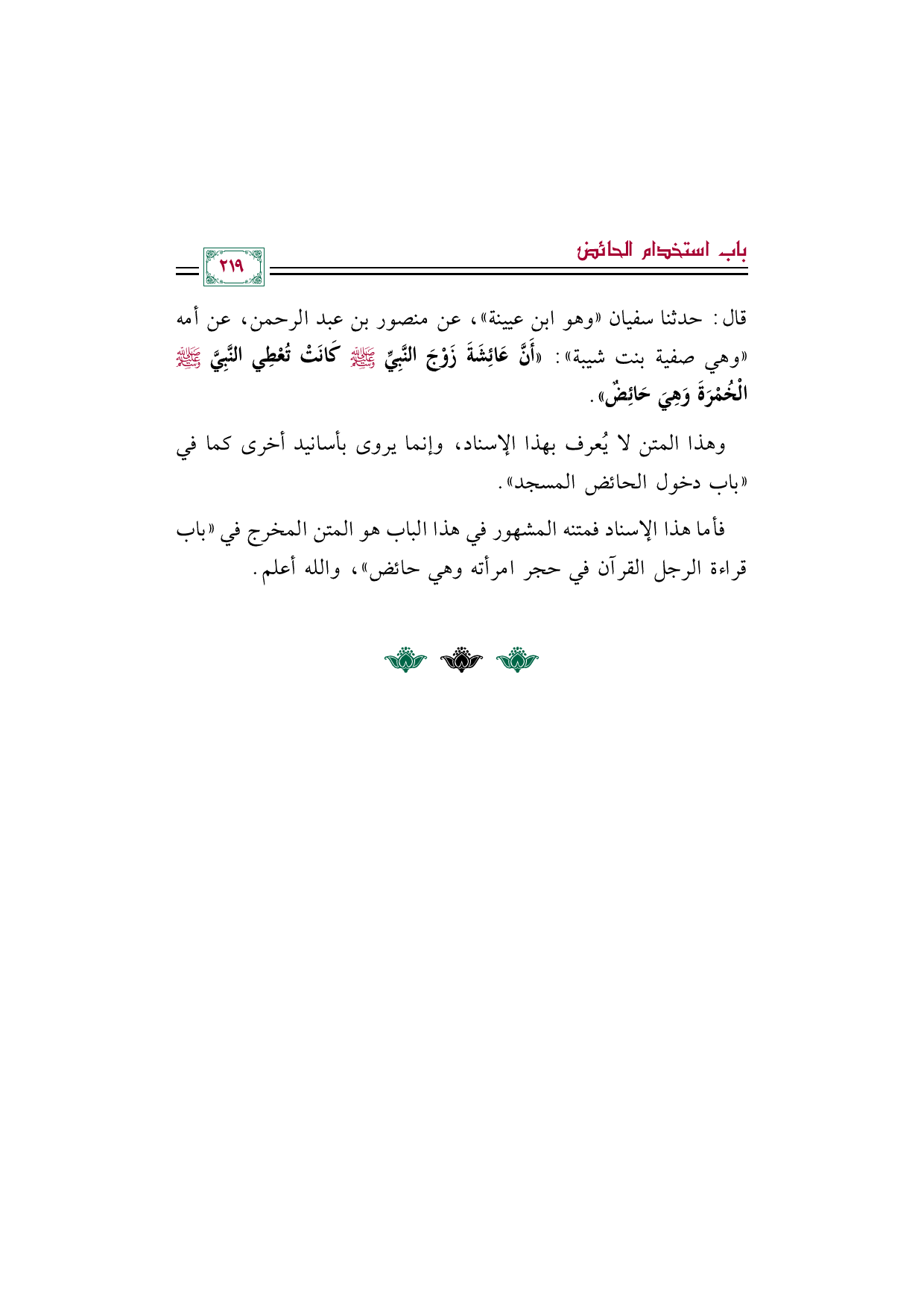 قال: حدثنا سفيان (وهو ابن عيينة)، عن منصور بن عبد الرحمن، عن أمه (وهي صفية بنت شيبة): ((أَنَّ عَائِشَةَ زَوْجَ النَّبِيِّ صَلَّى اللهُ عَلَيْهِ وَسَلَّمَ كَانَتْ تُعْطِي النَّبِيَّ صَلَّى اللهُ عَلَيْهِ وَسَلَّمَ الْخُمْرَةَ وَهِيَ حَائِضٌ)).
