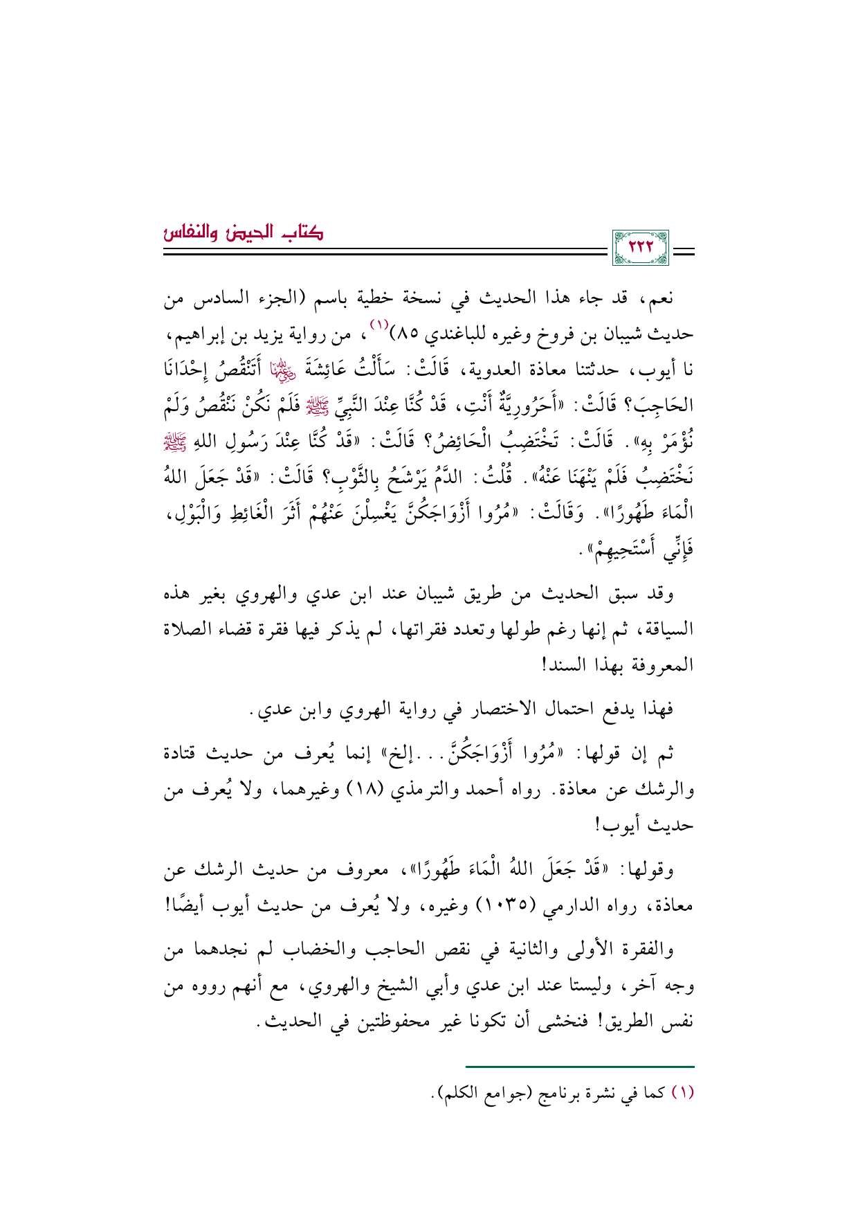 ثم إن قولها: ((مُرُوا أَزْوَاجَكُنَّ ... إلخ)) إنما يُعرف من حديث قتادة والرشك عن معاذة. رواه أحمد والترمذي (١٨) وغيرهما، ولا يُعرف من حديث أيوب!