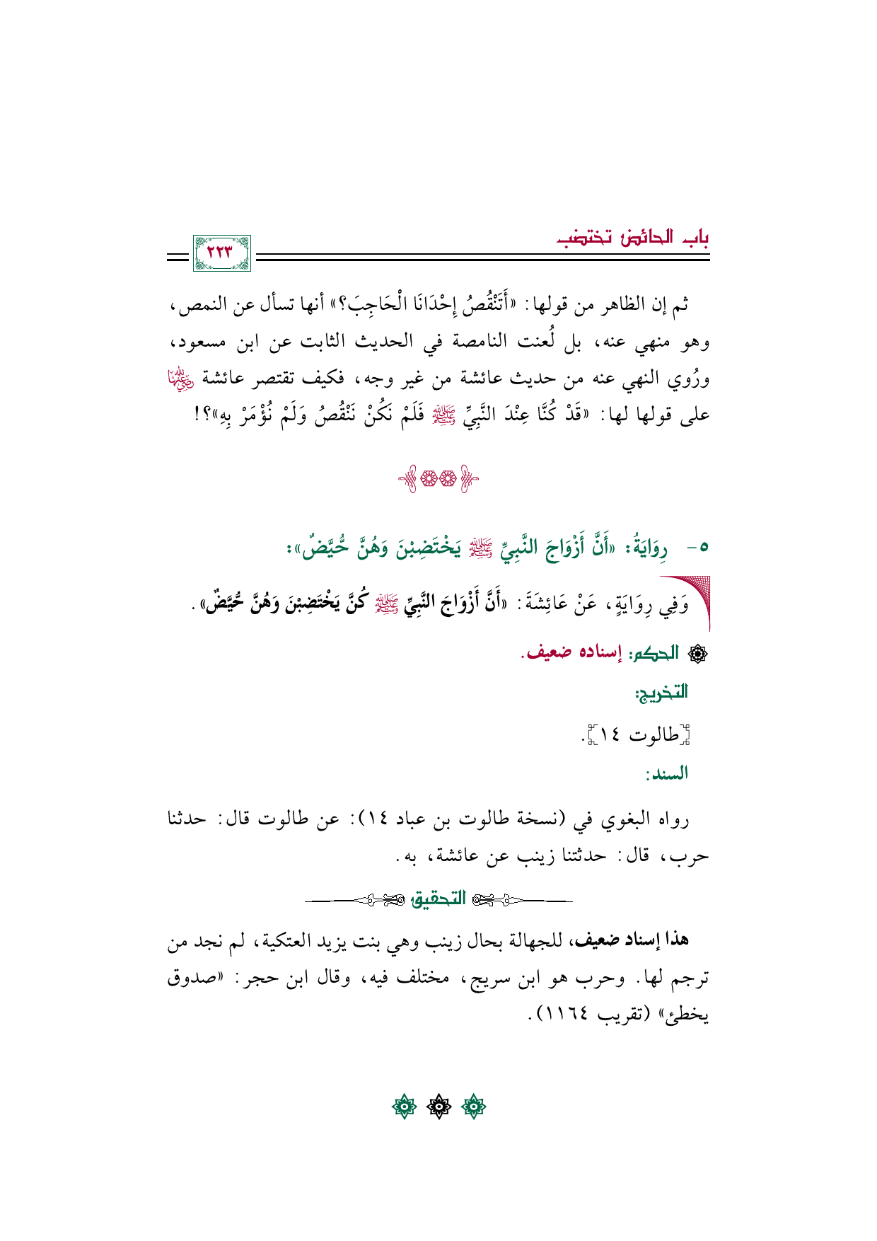 رواه البغوي في (نسخة طالوت بن عباد ١٤): عن طالوت قال: حدثنا حرب، قال: حدثتنا زينب عن عائشة، به.