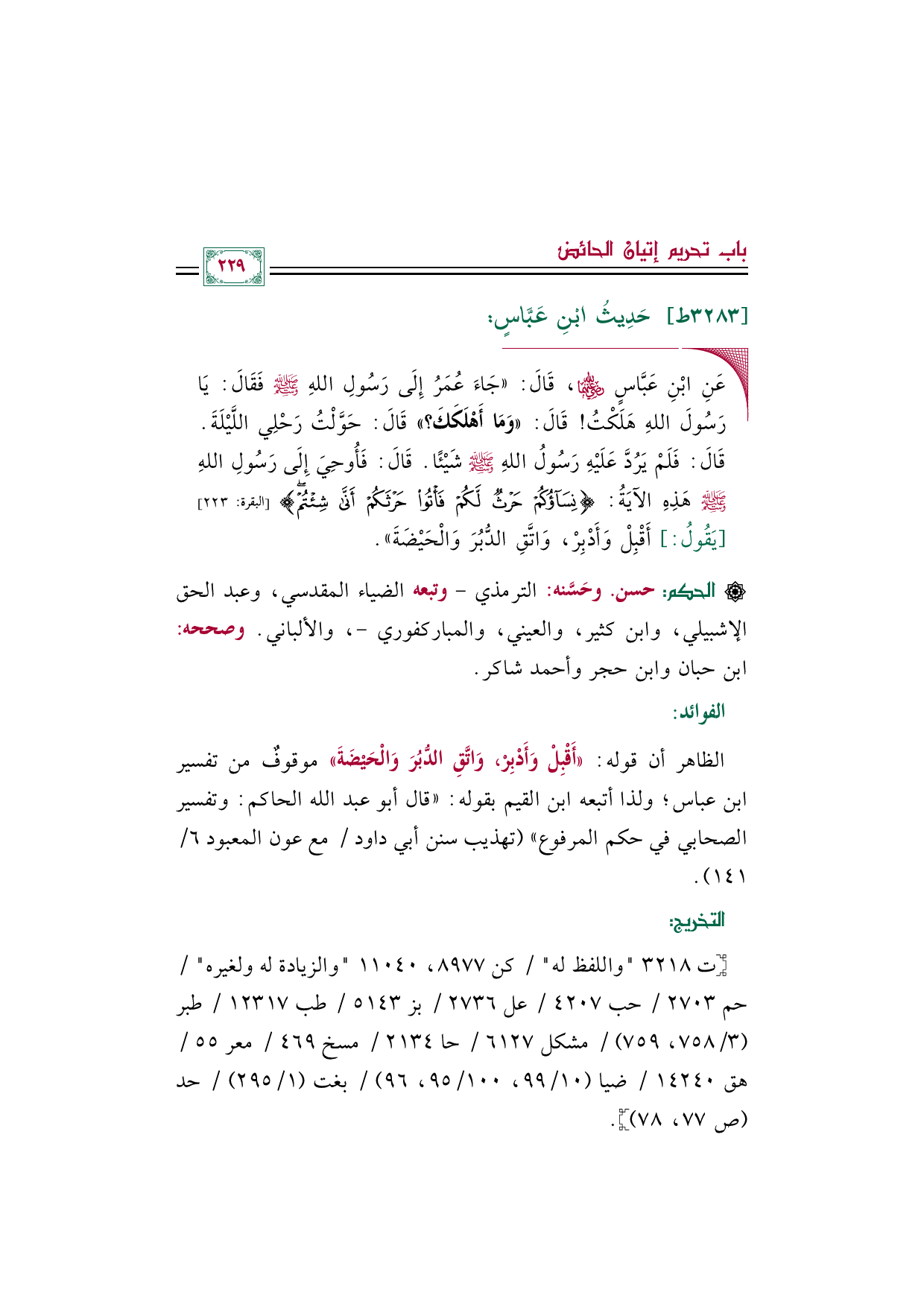 الظاهر أن قوله: ((أَقْبِلْ وَأَدْبِرْ، وَاتَّقِ الدُّبُرَ وَالْحَيْضَةَ)) موقوفٌ من تفسير ابن عباس؛ ولذا أتبعه ابن القيم بقوله: ((قال أبو عبد الله الحاكم: وتفسير الصحابي في حكم المرفوع)) (تهذيب سنن أبي داود/ مع عون المعبود ٦/ ١٤١).