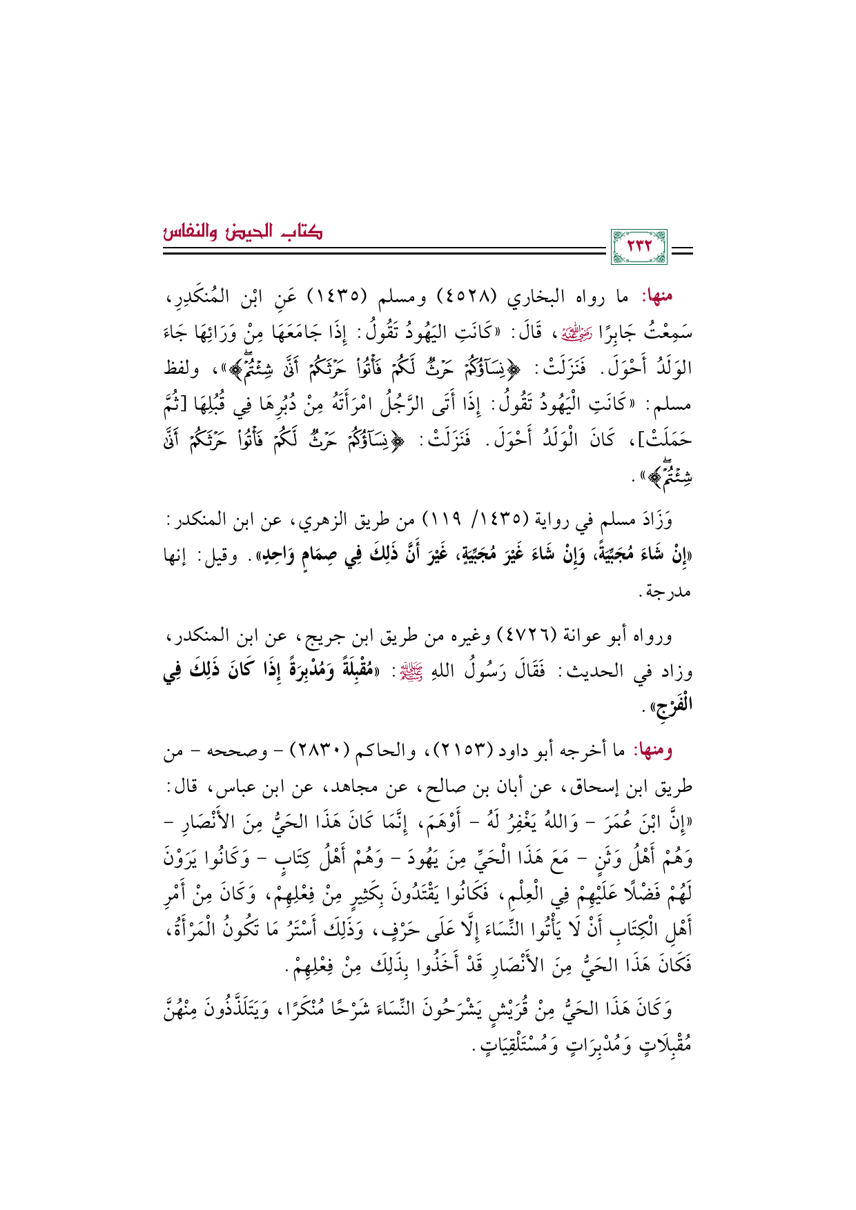 ورواه أبو عوانة (٤٧٢٦) وغيره من طريق ابن جريج، عن ابن المنكدر، وزاد في الحديث: فَقَالَ رَسُولُ اللهِ صَلَّى اللهُ عَلَيْهِ وَسَلَّمَ: ((مُقْبِلَةً وَمُدْبِرَةً إِذَا كَانَ ذَلِكَ فِي الْفَرْجِ)).