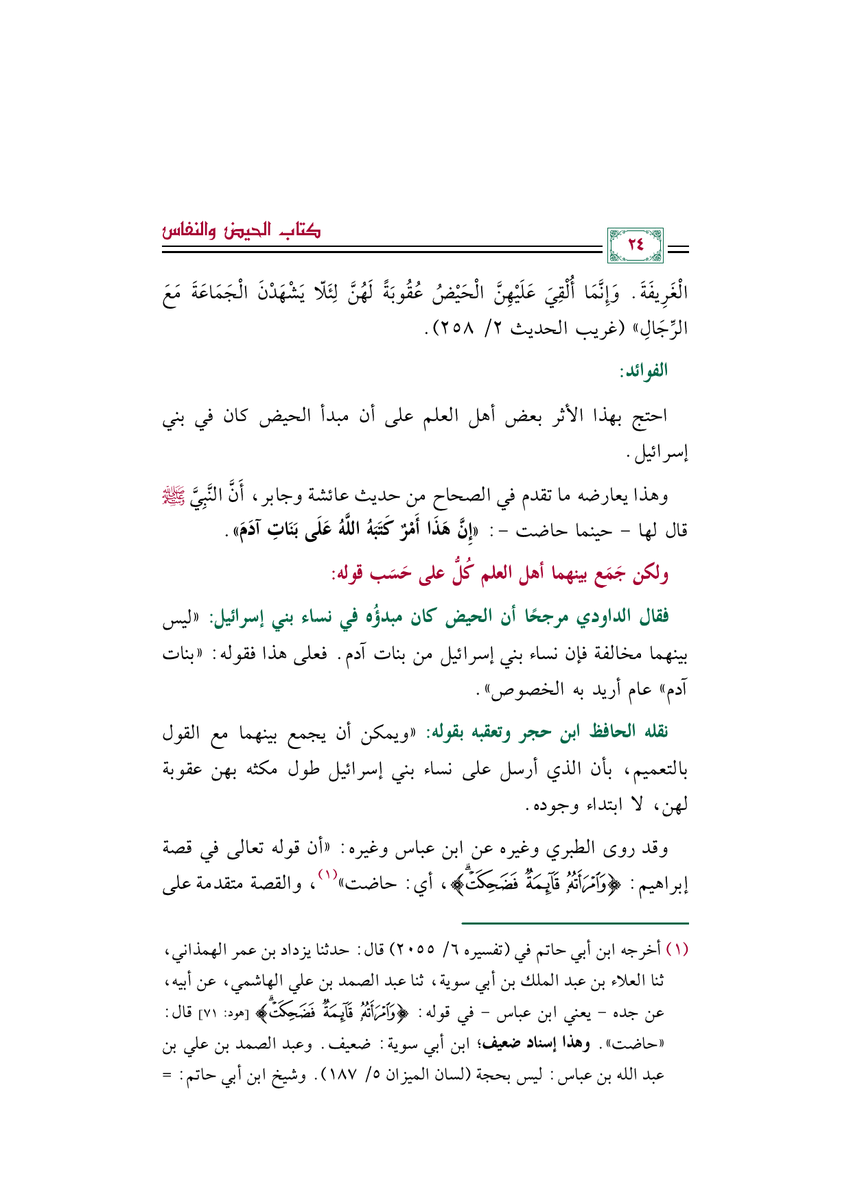 (¬١) أخرجه ابن أبي حاتم في (تفسيره ٦/ ٢٠٥٥) قال: حدثنا يزداد بن عمر الهمذاني، ثنا العلاء بن عبد الملك بن أبي سوية، ثنا عبد الصمد بن علي الهاشمي، عن أبيه، عن جده - يعني ابن عباس - في قوله: {وامرأته قائمة فضحكت} [هود: ٧١] قال: «حاضت». وهذا إسناد ضعيف؛ ابن أبي سوية: ضعيف. وعبد الصمد بن علي بن عبد الله بن عباس: ليس بحجة (لسان الميزان ٥/ ١٨٧). وشيخ ابن أبي حاتم: يزداد بن عمر الهمذاني، لم نعرفه.