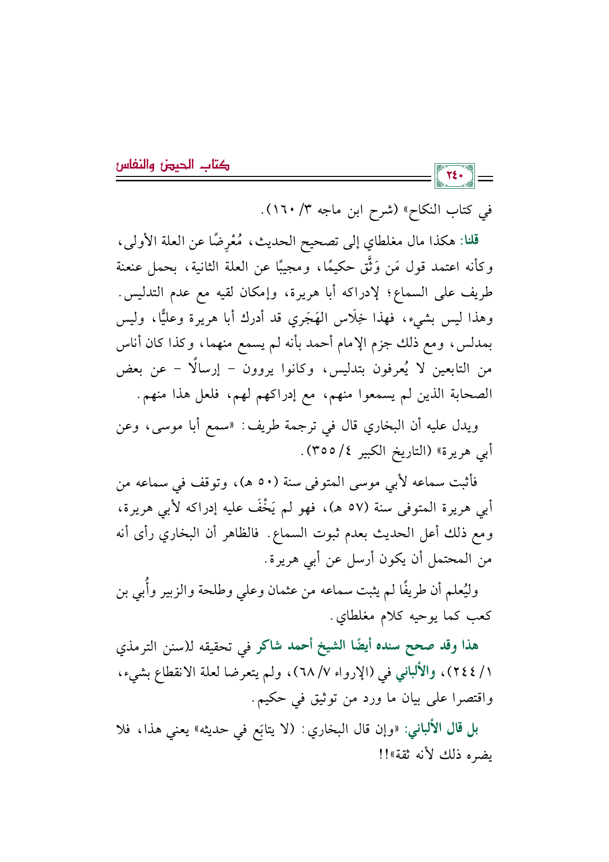 قلنا: هكذا مال مغلطاي إلى تصحيح الحديث، مُعْرِضًا عن العلة الأولى، وكأنه اعتمد قول مَن وَثَّق حكيمًا، ومجيبًا عن العلة الثانية، بحمل عنعنة طريف على السماع؛ لإدراكه أبا هريرة، وإمكان لقيه مع عدم التدليس. وهذا ليس بشيء، فهذا خِلَاس الهَجَري قد أدرك أبا هريرة وعليًّا، وليس بمدلس، ومع ذلك جزم الإمام أحمد بأنه لم يسمع منهما، وكذا كان أناس من التابعين لا يُعرفون بتدليس، وكانوا يروون - إرسالًا - عن بعض الصحابة الذين لم يسمعوا منهم، مع إدراكهم لهم، فلعل هذا منهم.