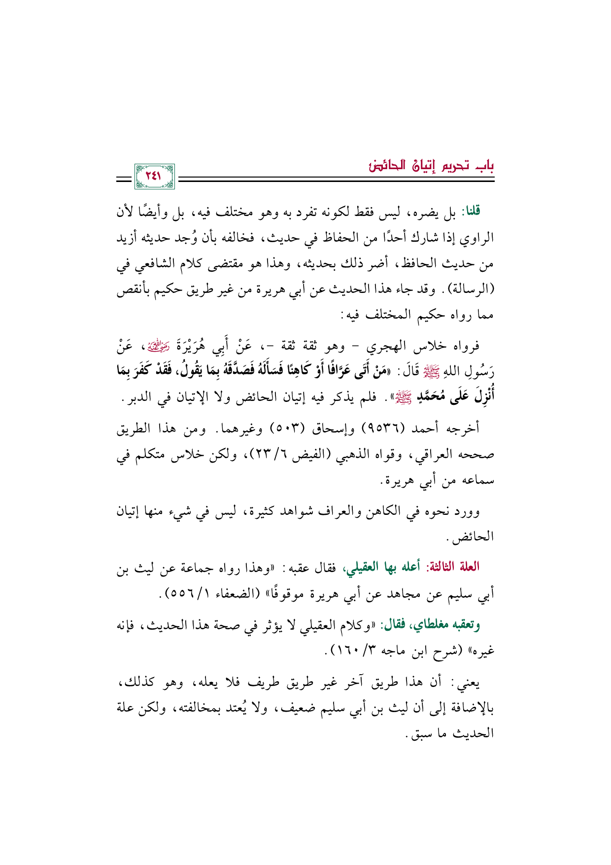 قلنا: بل يضره، ليس فقط لكونه تفرد به وهو مختلف فيه، بل وأيضًا لأن الراوي إذا شارك أحدًا من الحفاظ في حديث، فخالفه بأن وُجد حديثه أزيد من حديث الحافظ، أضر ذلك بحديثه، وهذا هو مقتضى كلام الشافعي في (الرسالة). وقد جاء هذا الحديث عن أبي هريرة من غير طريق حكيم بأنقص مما رواه حكيم المختلف فيه:
