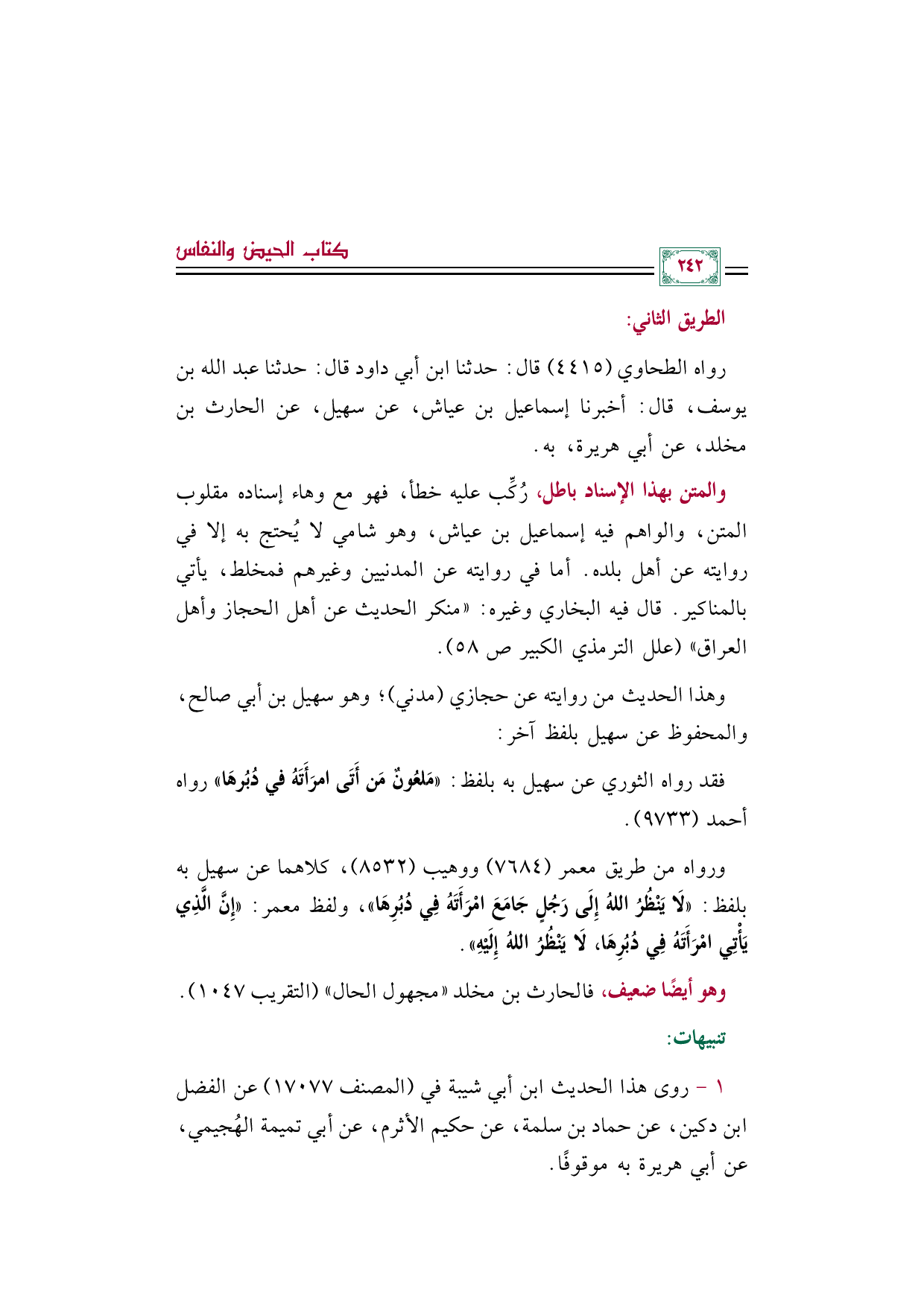 فقد رواه الثوري عن سهيل به بلفظ: ((مَلعُونٌ مَن أَتَى امرَأَتَهُ في دُبُرهَا)) رواه أحمد (٩٧٣٣).