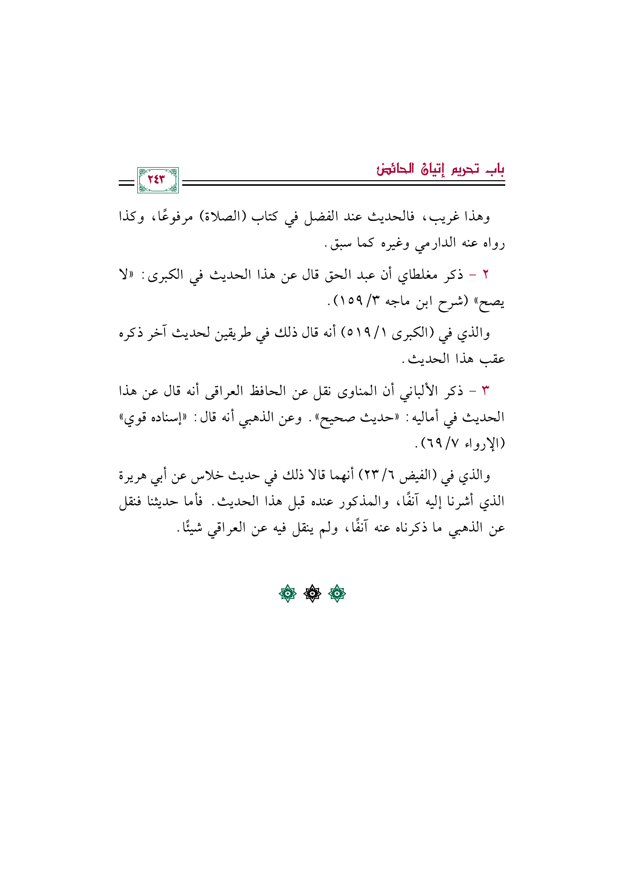 والذي في (الفيض ٦/ ٢٣) أنهما قالا ذلك في حديث خلاس عن أبي هريرة الذي أشرنا إليه آنفًا، والمذكور عنده قبل هذا الحديث. فأما حديثنا فنقل عن الذهبي ما ذكرناه عنه آنفًا، ولم ينقل فيه عن العراقي شيئًا.