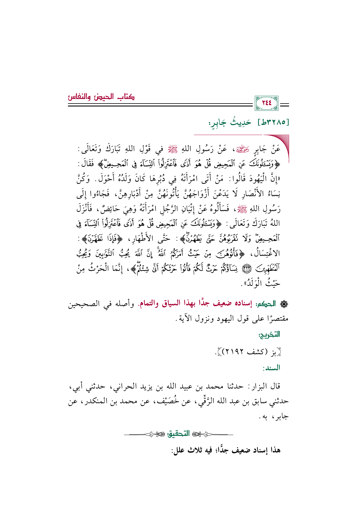 ◼ عَنْ جَابِرٍ رَضِيَ اللهُ عَنْهُ، عَنْ رَسُولِ اللهِ صَلَّى اللهُ عَلَيْهِ وَسَلَّمَ في قَوْلِ اللهِ تَبَارَكَ وَتَعَالَى: {وَيَسْأَلُونَكَ عَنِ الْمَحِيضِ قُلْ هُوَ أَذًى فَاعْتَزِلُوا النِّسَاءَ فِي الْمَحِيضِ} فَقَالَ: ((إِنَّ الْيَهُودَ قَالُوا: مَنْ أَتَى امْرَأَتَهُ فِي دُبُرِهَا كَانَ وَلَدُهُ أَحْوَلَ. وَكُنَّ نِسَاءُ الأَنْصَارِ لَا يَدَعْنَ أَزْوَاجَهُنَّ يَأْتُونَهُنَّ مِنْ أَدْبَارِهِنَّ، فَجَاءُوا إِلَى رَسُولِ اللهِ صَلَّى اللهُ عَلَيْهِ وَسَلَّمَ، فَسَأَلُوهُ عَنْ إِتْيَانِ الرَّجُلِ امْرَأَتَهُ وَهِيَ حَائِضٌ، فَأَنْزَلَ اللهُ تَبَارَكَ وَتَعَالَى: {وَيَسْأَلُونَكَ عَنِ الْمَحِيضِ قُلْ هُوَ أَذًى فَاعْتَزِلُوا النِّسَاءَ فِي الْمَحِيضِ وَلَا تَقْرَبُوهُنَّ حَتَّى يَطْهُرْنَ}: حَتَّى الأَطْهَارِ، {فَإِذَا تَطَهَّرْنَ}: الاغْتِسَالُ، {فَأْتُوهُنَّ مِنْ حَيْثُ أَمَرَكُمُ اللهُ إِنَّ اللهَ يُحِبُّ التَّوَّابِينَ وَيُحِبُّ الْمُتَطَهِّرِينَ نِسَاؤُكُمْ حَرْثٌ لَكُمْ فَأْتُوا حَرْثَكُمْ أَنَّى شِئْتُمْ}، إِنَّمَا الْحَرْثُ مِنْ حَيْثُ الْوَلَدُ)).
