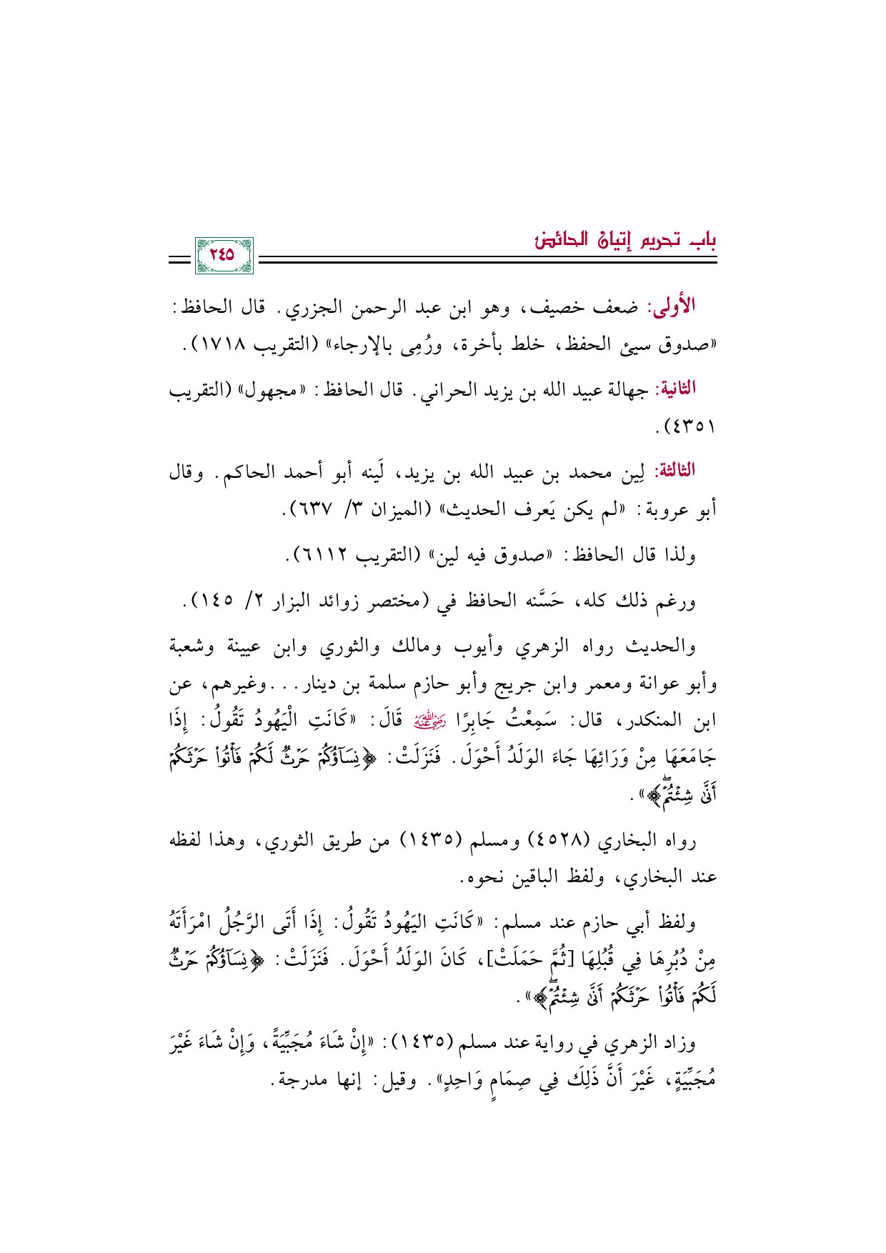 والحديث رواه الزهري وأيوب ومالك والثوري وابن عيينة وشعبة وأبو عوانة ومعمر وابن جريج وأبو حازم سلمة بن دينار ... وغيرهم، عن ابن المنكدر، قال: سَمِعْتُ جَابِرًا رَضِيَ اللهُ عَنْهُ قَالَ: ((كَانَتِ الْيَهُودُ تَقُولُ: إِذَا جَامَعَهَا مِنْ وَرَائِهَا جَاءَ الوَلَدُ أَحْوَلَ. فَنَزَلَتْ: {نِسَاؤُكُمْ حَرْثٌ لَكُمْ فَأْتُوا حَرْثَكُمْ أَنَّى شِئْتُمْ})).