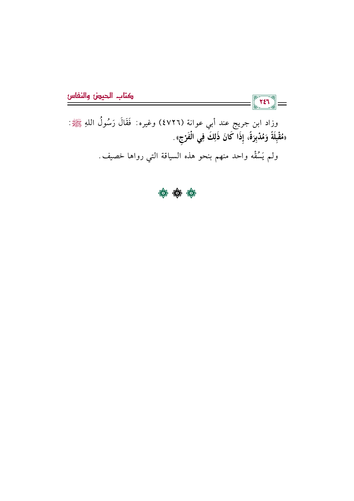 وزاد ابن جريج عند أبي عوانة (٤٧٢٦) وغيره: فَقَالَ رَسُولُ اللهِ صَلَّى اللهُ عَلَيْهِ وَسَلَّمَ: ((مُقْبِلَةً وَمُدْبِرَةً، إِذَا كَانَ ذَلِكَ فِي الْفَرْجِ)).