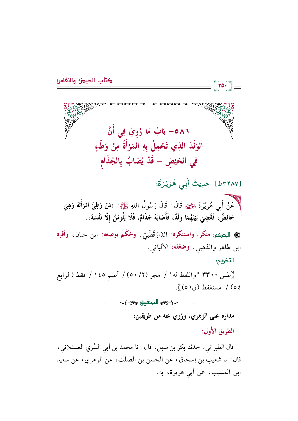 ٥٨١ - بَابُ مَا رُوِيَ فِي أَنَّ الوَلَدَ الذِي تَحْمِلُ بِهِ المَرْأَةُ مِنْ وَطْءٍ فِي الحَيْضِ- قَدْ يُصَابُ بِالجُذَامِ