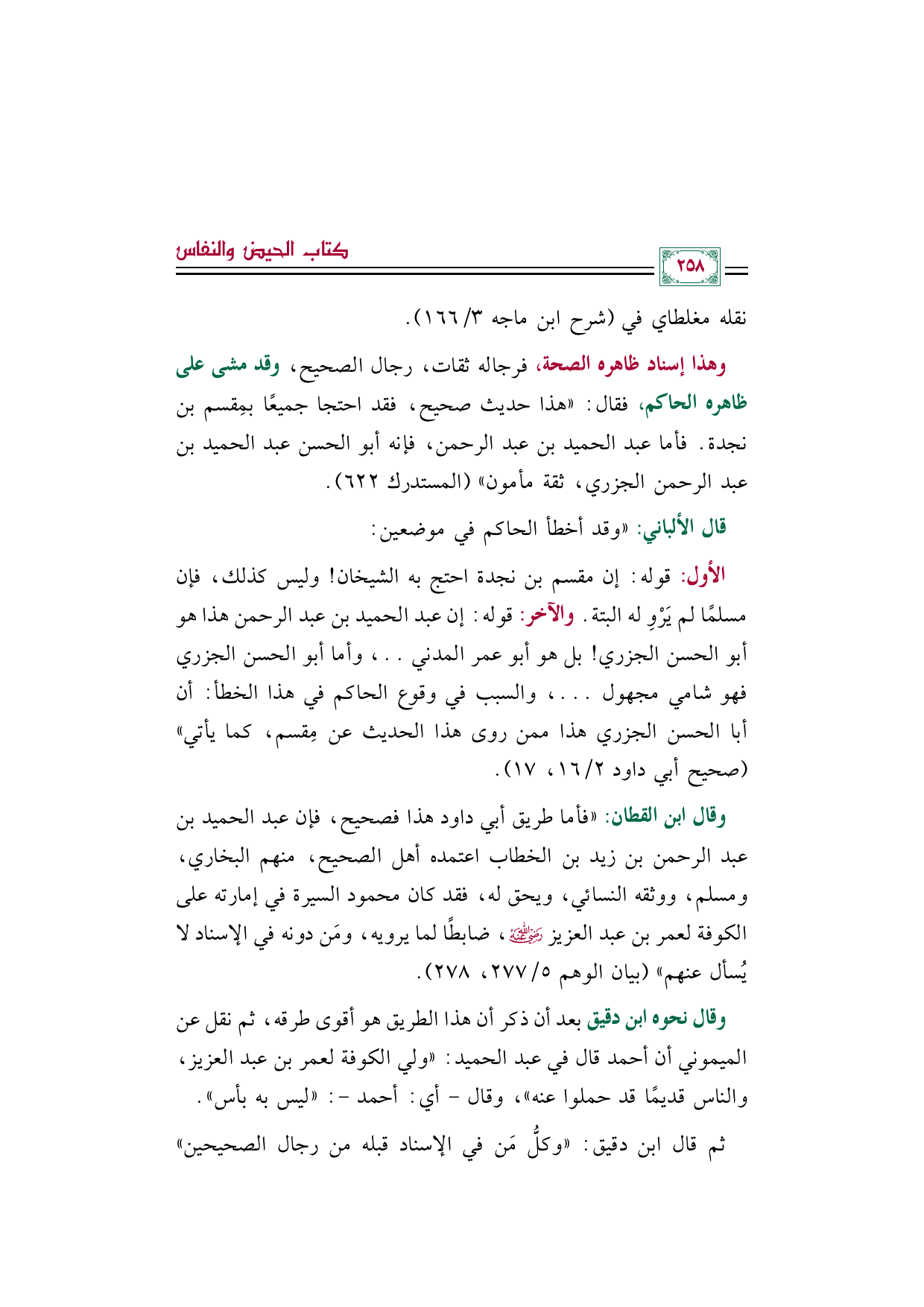 وهذا إسناد ظاهره الصحة، فرجاله ثقات، رجال الصحيح، وقد مشى على ظاهره الحاكم، فقال: ((هذا حديث صحيح، فقد احتجا جميعًا بمِقسم بن نجدة. فأما عبد الحميد بن عبد الرحمن، فإنه أبو الحسن عبد الحميد بن عبد الرحمن الجزري، ثقة مأمون)) (المستدرك ٦٢٢).