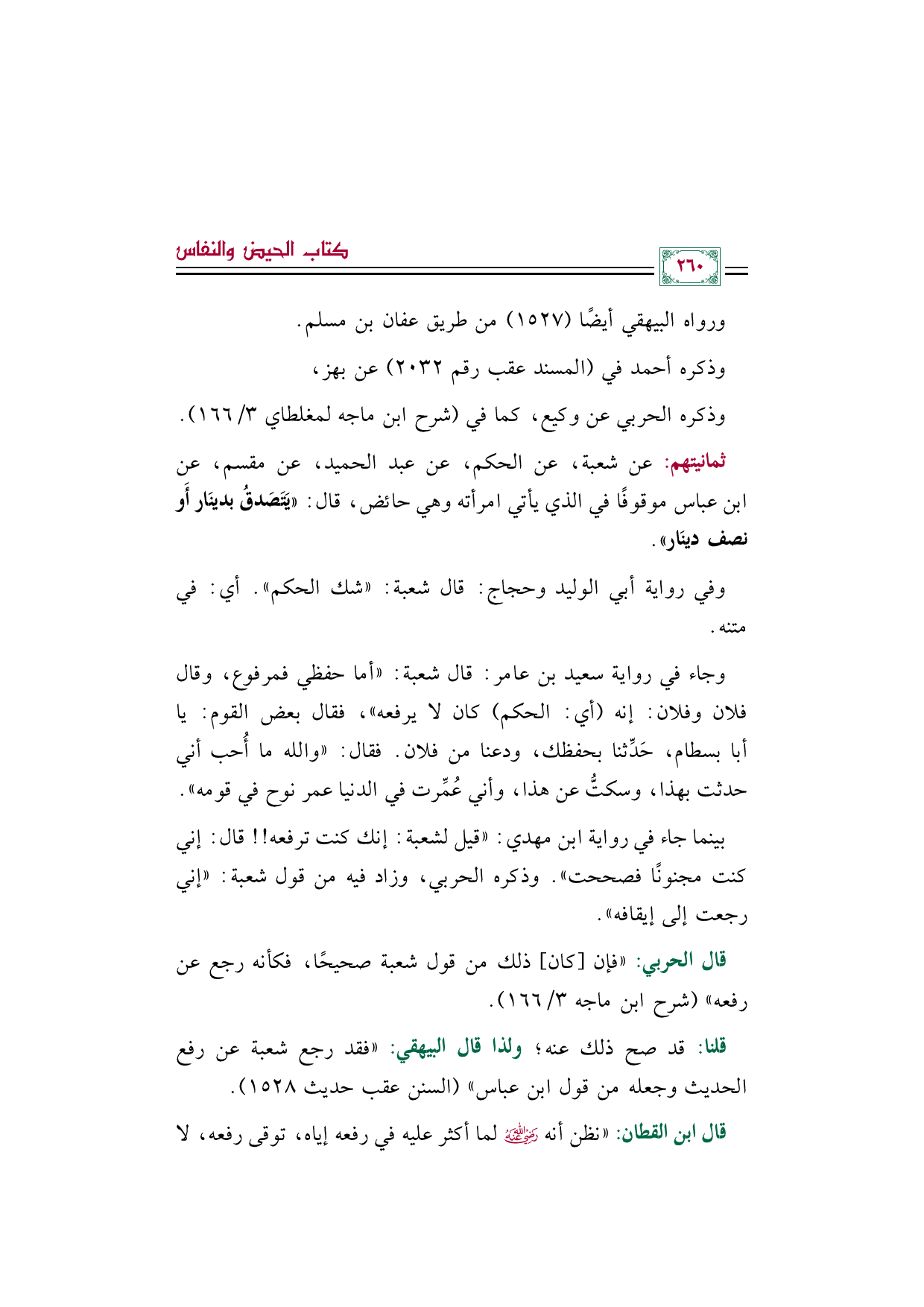 ثمانيتهم: عن شعبة، عن الحكم، عن عبد الحميد، عن مقسم، عن ابن عباس موقوفًا في الذي يأتي امرأته وهي حائض، قال: ((يَتَصَدقُ بدينَار أَو نصف دينَار)).