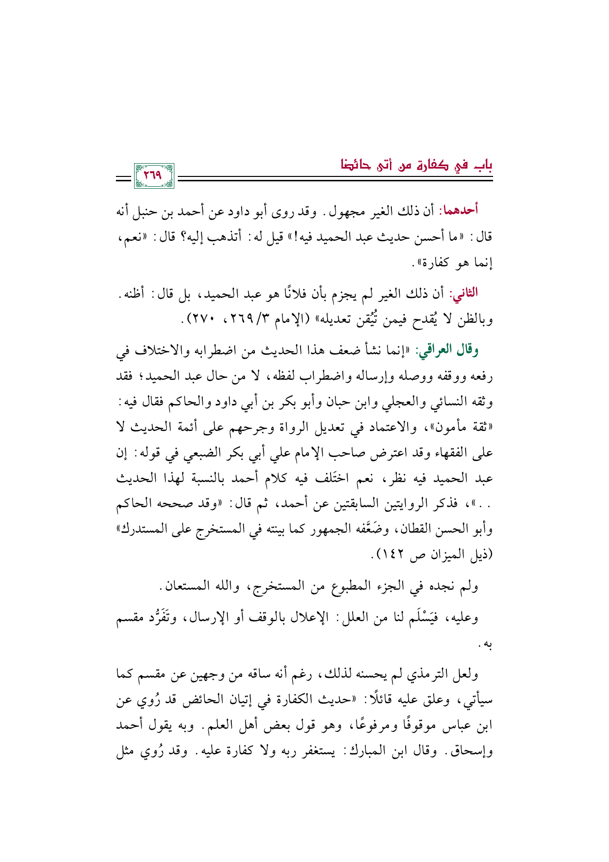 أحدهما: أن ذلك الغير مجهول. وقد روى أبو داود عن أحمد بن حنبل أنه قال: ((ما أحسن حديث عبد الحميد فيه! )) قيل له: أتذهب إليه؟ قال: ((نعم، إنما هو كفارة)).