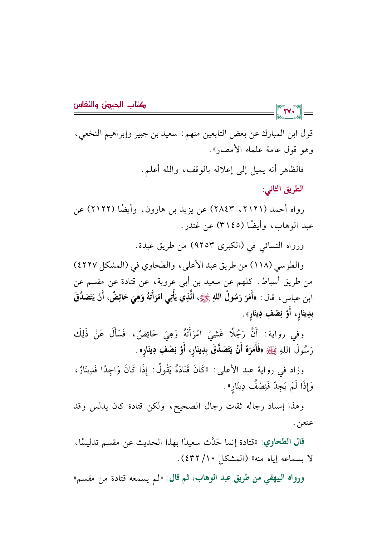 والطوسي (١١٨) من طريق عبد الأعلى، والطحاوي في (المشكل ٤٢٢٧) من طريق أسباط. كلهم عن سعيد بن أبي عروبة، عن قتادة عن مقسم عن ابن عباس، قال: ((أَمَرَ رَسُولُ اللهِ صَلَّى اللهُ عَلَيْهِ وَسَلَّمَ، الَّذِي يَأْتِي امْرَأَتَهُ وَهِيَ حَائِضٌ، أَنْ يَتَصَدَّقَ بِدِينَارٍ، أَوْ نِصْفِ دِينَارٍ)).