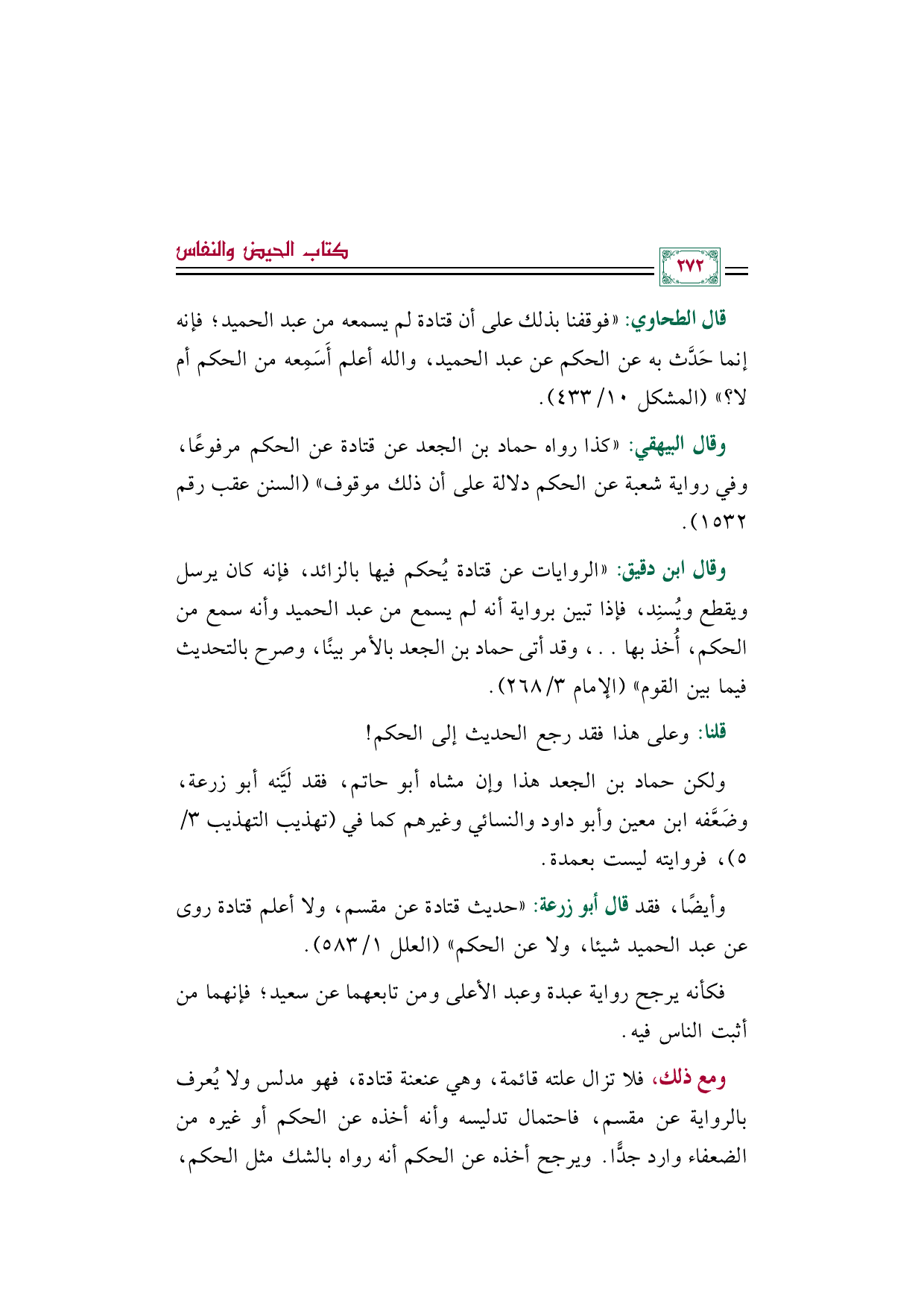 وقال ابن دقيق: ((الروايات عن قتادة يُحكم فيها بالزائد، فإنه كان يرسل ويقطع ويُسنِد، فإذا تبين برواية أنه لم يسمع من عبد الحميد وأنه سمع من الحكم، أُخذ بها .. ، وقد أتى حماد بن الجعد بالأمر بينًا، وصرح بالتحديث فيما بين القوم)) (الإمام ٣/ ٢٦٨).