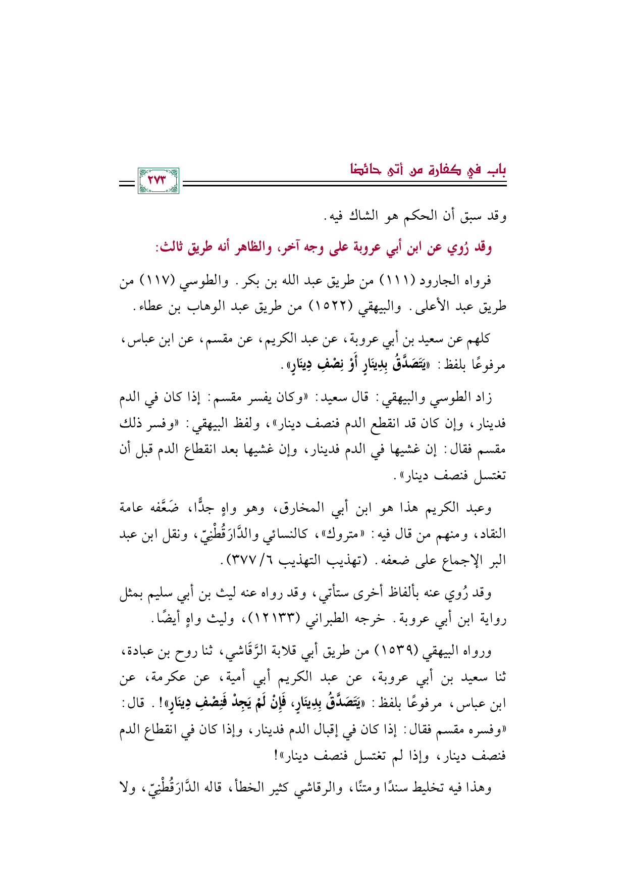 زاد الطوسي والبيهقي: قال سعيد: ((وكان يفسر مقسم: إذا كان في الدم فدينار، وإن كان قد انقطع الدم فنصف دينار))، ولفظ البيهقي: ((وفسر ذلك مقسم فقال: إن غشيها في الدم فدينار، وإن غشيها بعد انقطاع الدم قبل أن تغتسل فنصف دينار)).