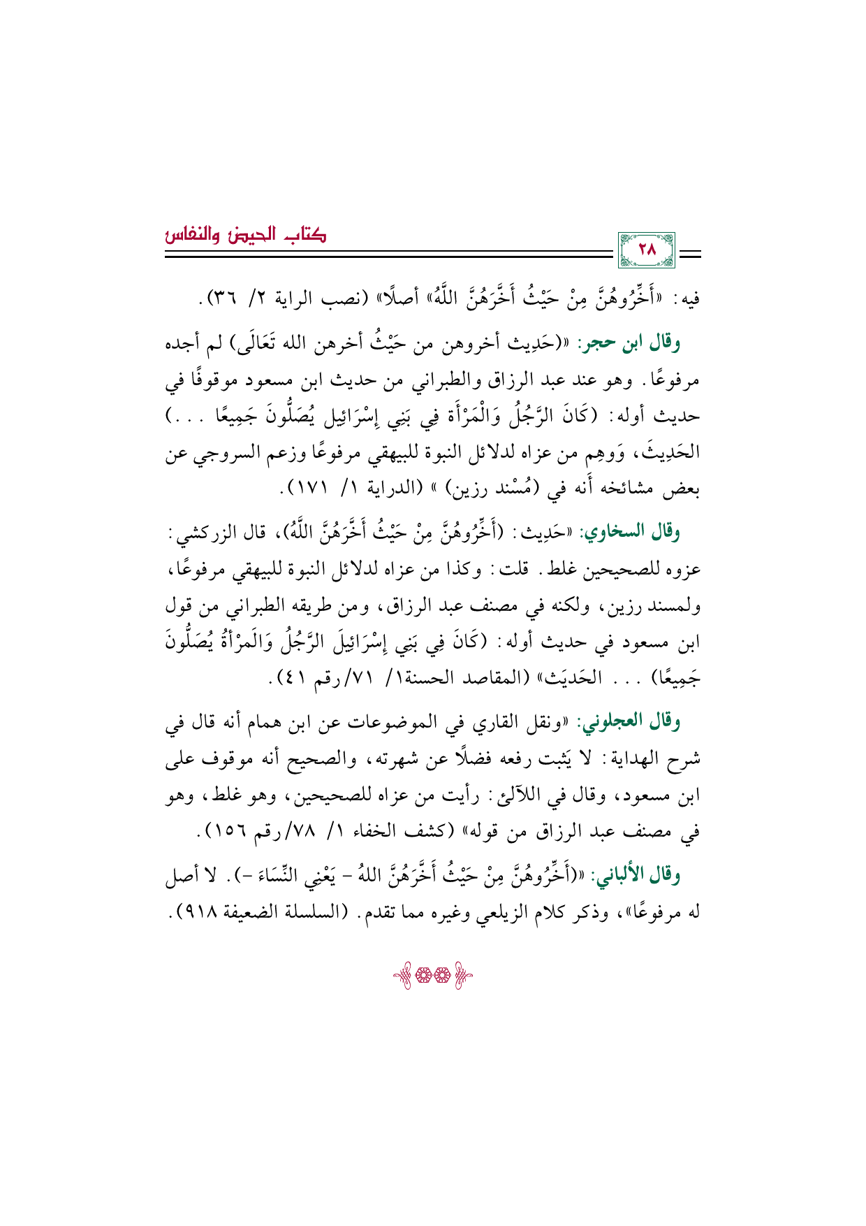 وقال ابن حجر: " (حَدِيث أخروهن من حَيْثُ أخرهن الله تَعَالَى) لم أجده مرفوعًا. وهو عند عبد الرزاق والطبراني من حديث ابن مسعود موقوفًا في حديث أوله: (كَانَ الرَّجُلُ وَالْمَرْأَة فِي بَنِي إِسْرَائِيل يُصَلُّونَ جَمِيعًا ... ) الحَدِيثَ، وَوهِم من عزاه لدلائل النبوة للبيهقي مرفوعًا وزعم السروجي عن بعض مشائخه أَنه في (مُسْند رزين) " (الدراية ١/ ١٧١).
