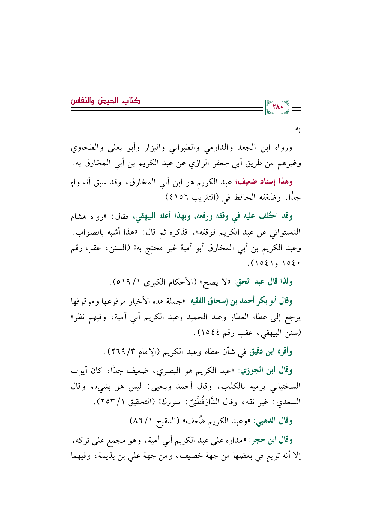 وقال أبو بكر أحمد بن إسحاق الفقيه: ((جملة هذه الأخبار مرفوعها وموقوفها يرجع إلى عطاء العطار وعبد الحميد وعبد الكريم أبي أمية، وفيهم نظر)) (سنن البيهقي، عقب رقم ١٥٤٤).